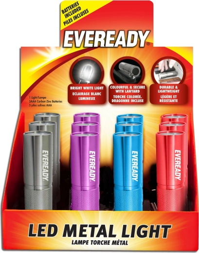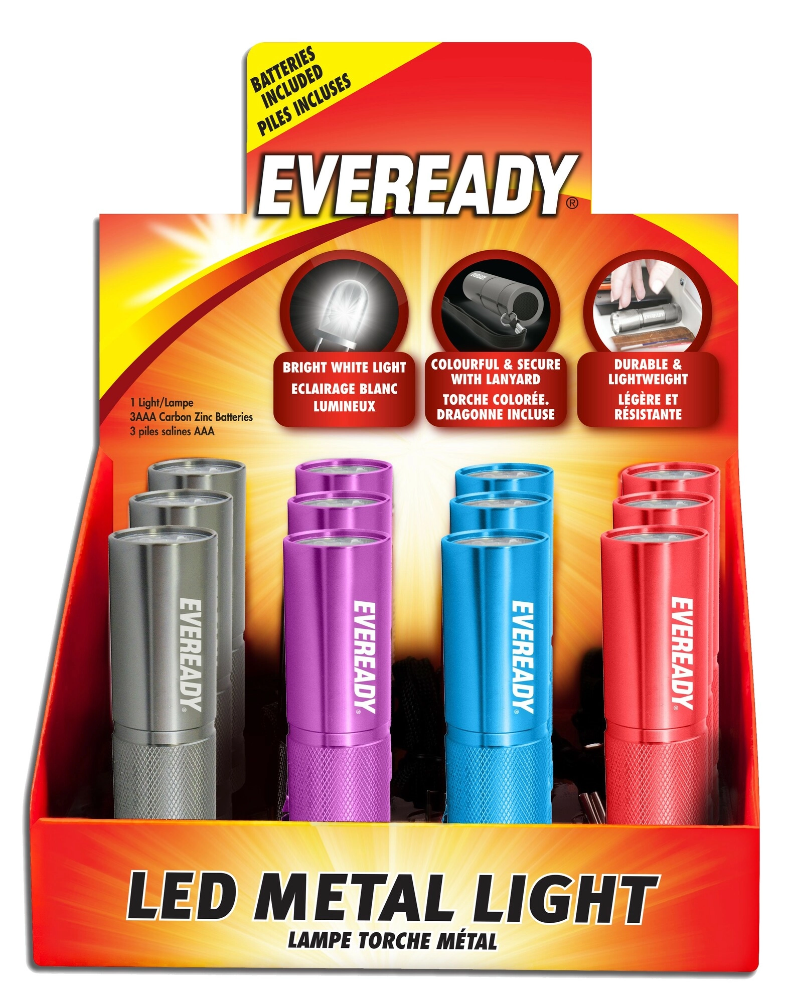 The compact ENERGIZER Eveready Metal pocket flashlight is ideal for your keys or pocket. It features a metal body for enhanced durability, 3× AAA power for easy replacement, and is sold as 1 piece in assorted colors (black, purple, turquoise, red).