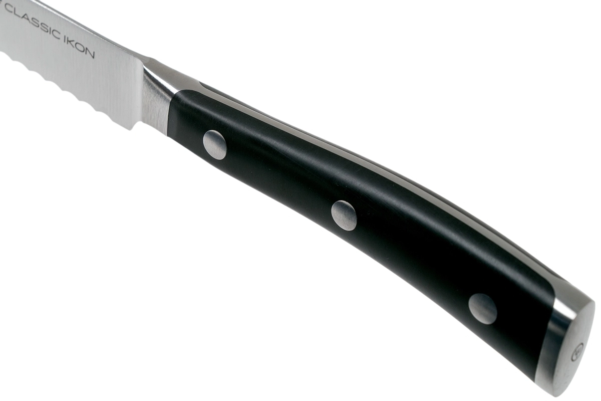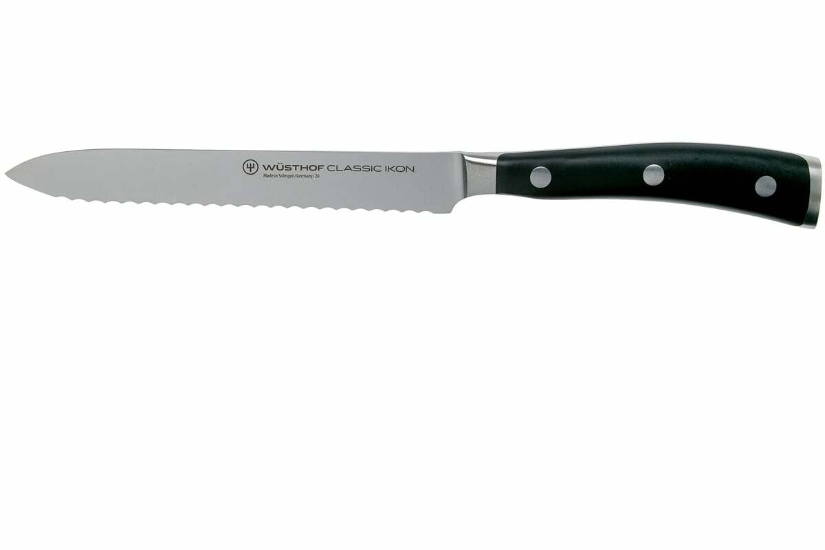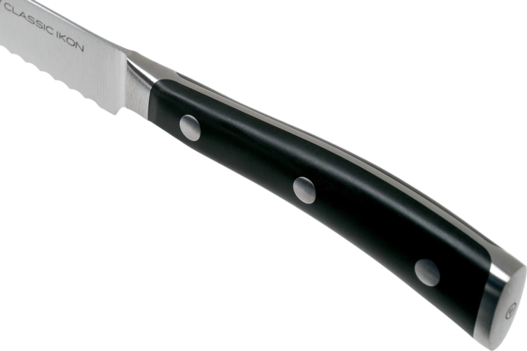 The Wüsthof CLASSIC IKON 14 cm serrated utility knife is the precise helper you’ll reach for every day. Its serrated edge confidently bites into tougher surfaces and glides through a crusty baguette, tomato skin, and even juicy melon. Thanks to the balanced full‑tang construction, you have great control over every cut.