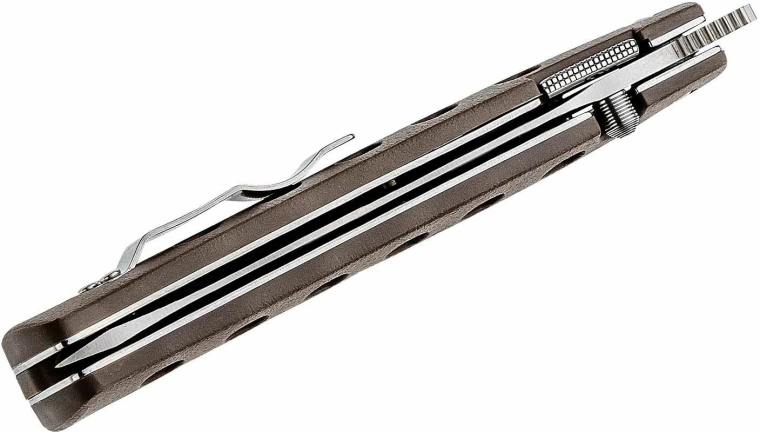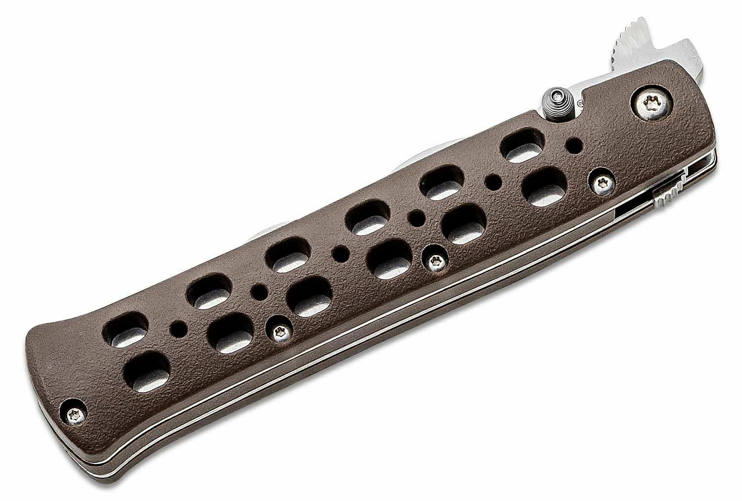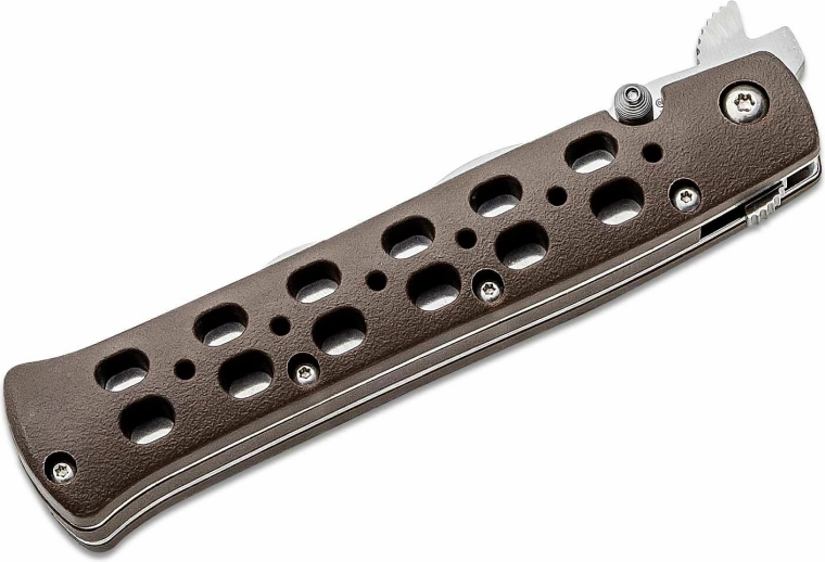The blade is made from Japanese stainless AUS-10A with a satin grind, offering an excellent balance of sharpness, toughness, and corrosion resistance. The frame features Cold Steel’s robust leaf-spring lock with a rated holding strength of approximately 66 kg, so you can rely on safety during demanding tasks. The ergonomic brown Zy-Ex handle is lightweight, strong, and pleasantly textured for a secure grip.