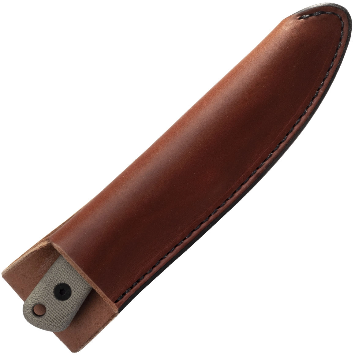 The textured Micarta handle in gray provides a secure grip even when wet. The full-tang construction increases strength, the pronounced guard protects the hand from slipping, and the lanyard hole makes securing the knife easier. The package includes a quality leather sheath with a belt loop for safe and comfortable carry.