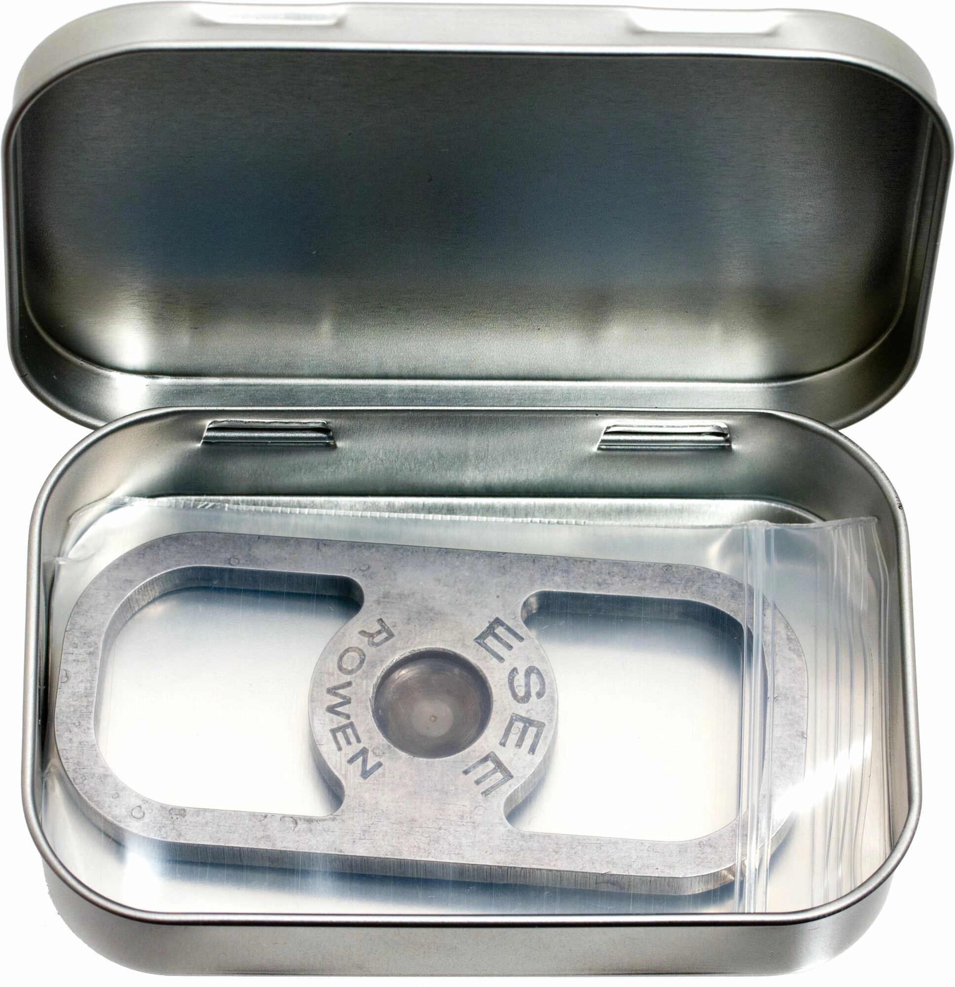 The thoughtful shape adds multiple functions in one: sharp edges serve as an effective striker for a ferro rod, and the central dimple can be used as a bearing block for a bow drill. The included metal tin with a hinged lid is perfect for making char cloth and safely storing small tinders.