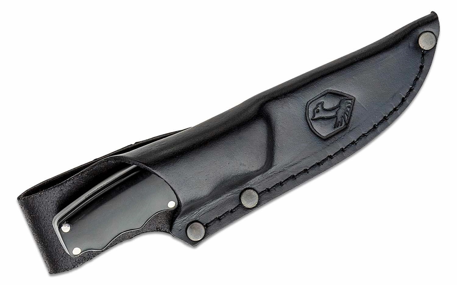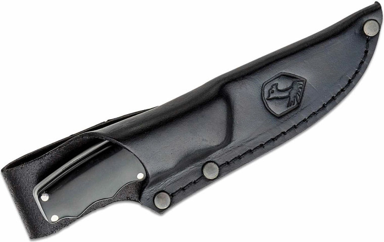 The handle made of tough G10 composite in black provides a secure and comfortable grip, even with gloves or in wet conditions. The package includes a quality leather sheath for safe and stylish belt carry.