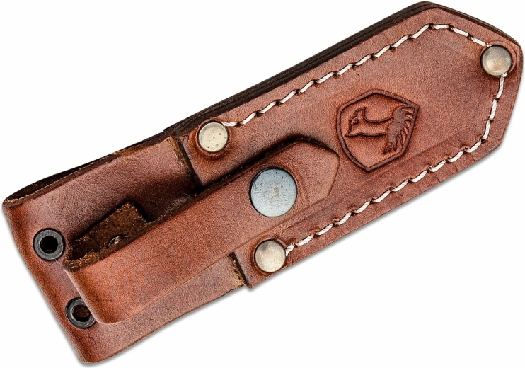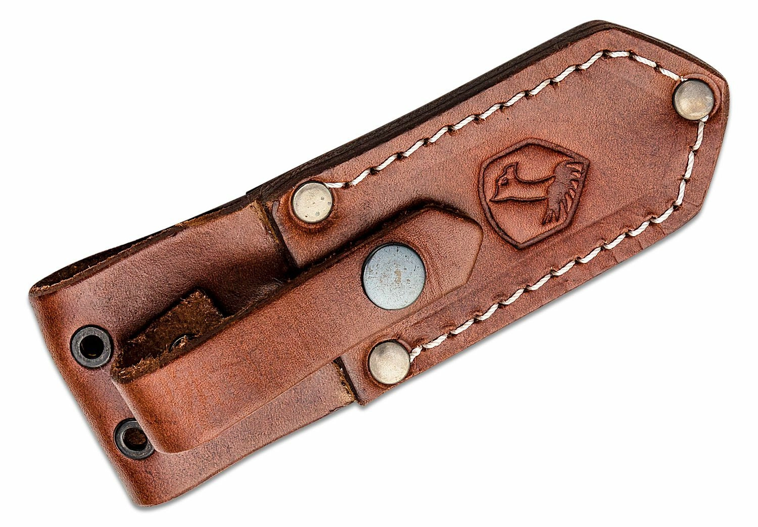 The brown Micarta handle is shaped for a secure grip, and its textured surface holds firm even in demanding conditions. The dagger comes with a quality leather sheath that allows safe and comfortable carry in daily use.