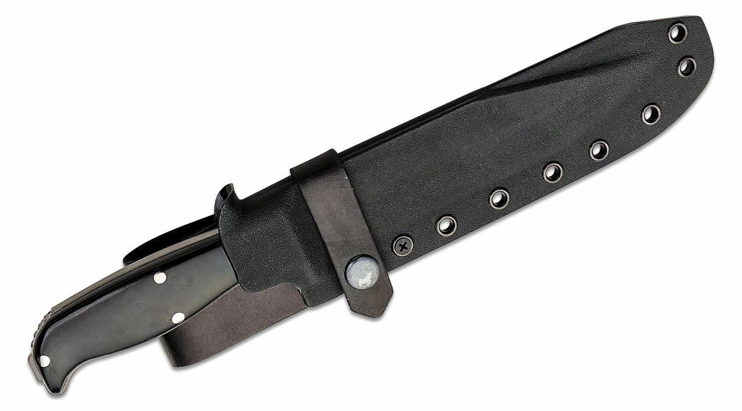 The black Micarta handle offers a safe and comfortable grip even when wet or while wearing gloves. The integrated striking pommel at the end of the handle serves as an emergency hammer. The knife comes with a sturdy Kydex sheath with a leather loop for multiple carry options.