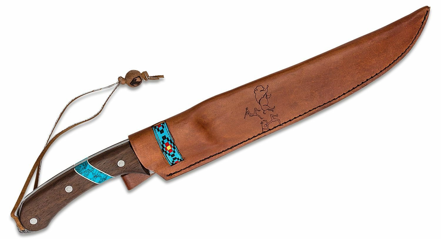The handle made from durable walnut wood with a turquoise inlay fits the hand well and offers a secure grip. A practical lanyard hole increases safety during work. The leather sheath with traditional embellishments allows comfortable and stylish carry.