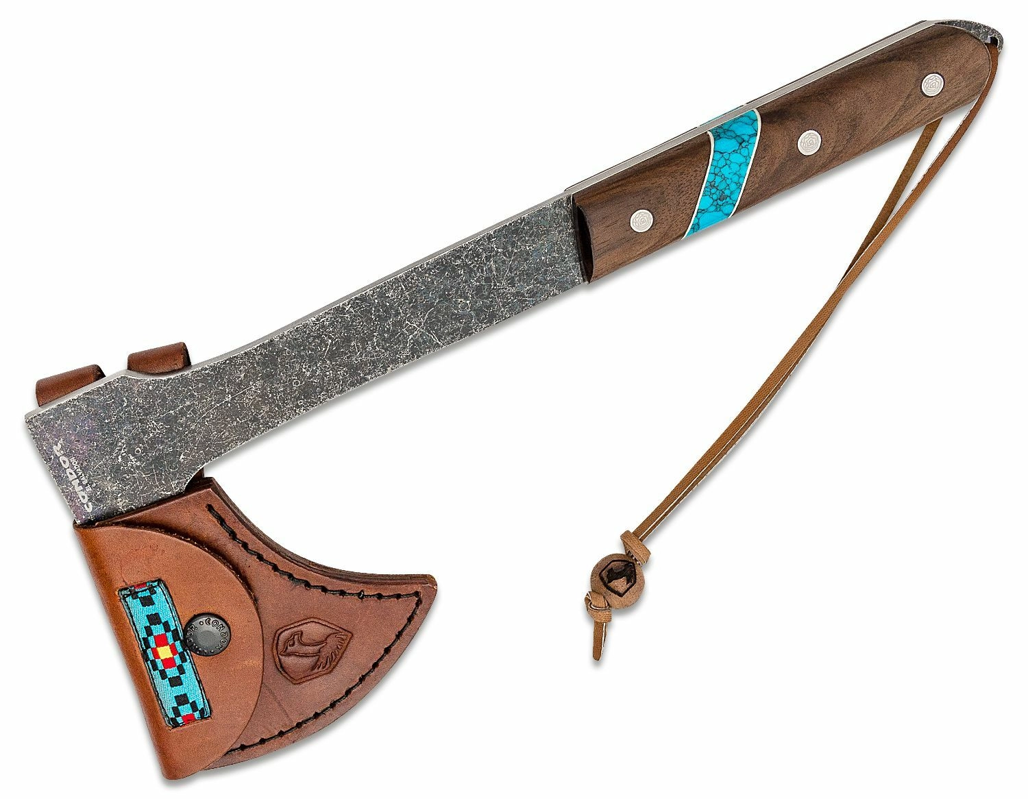 A lightweight, durable tomahawk for the outdoors. 1075 high-carbon steel head with a natural finish, full-tang construction, and an ergonomic walnut handle accented with turquoise stone. Includes a quality leather sheath. Ideal for camping, bushcraft, and outdoor activities. 1075 carbon steel, full-tang construction, walnut wood, leather sheath included.
