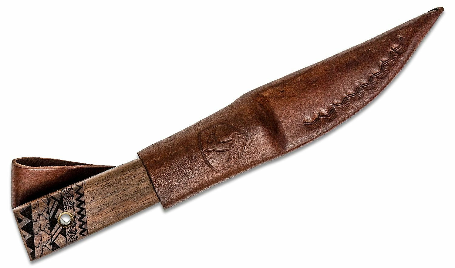 The walnut wood handle fits perfectly in the hand, and the brass wrap not only adds an attractive look but also a more secure grip. The end features carved details and a lanyard hole for added functionality and aesthetics. A high-quality leather sheath for safe belt carry is included.