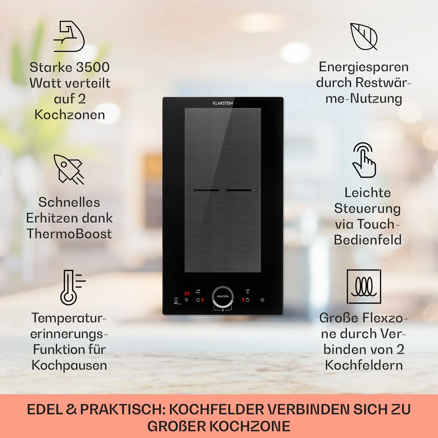The compact and powerful Klarstein Delicatessa Slim induction cooktop delivers flexible cooking, low energy consumption, and an elegant glass-ceramic surface. It offers two cooking zones with a total output of 3500 W, a VarioHeating function to combine them into one flex zone, ThermoBoost for rapid heating, and a practical touch control panel with a timer up to 99 minutes.