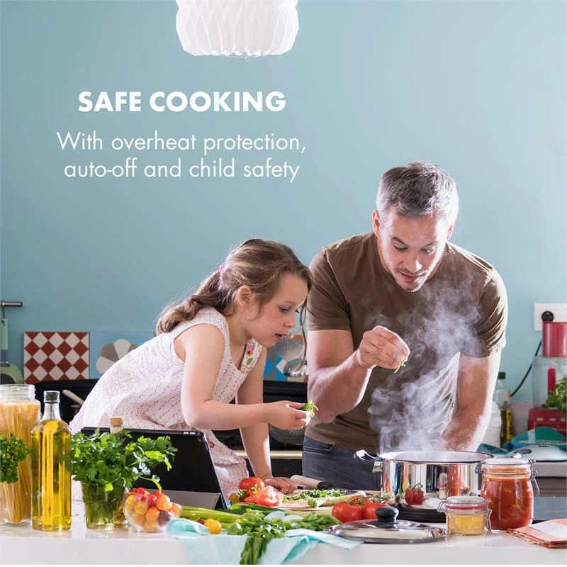 Smart features take care of safety and efficiency: EcoThermal Control uses residual heat, overheat protection with auto shut-off monitors operation, and the child lock prevents unintended changes to settings. The elegant glass-ceramic surface is easy to clean and fits perfectly into any kitchen.