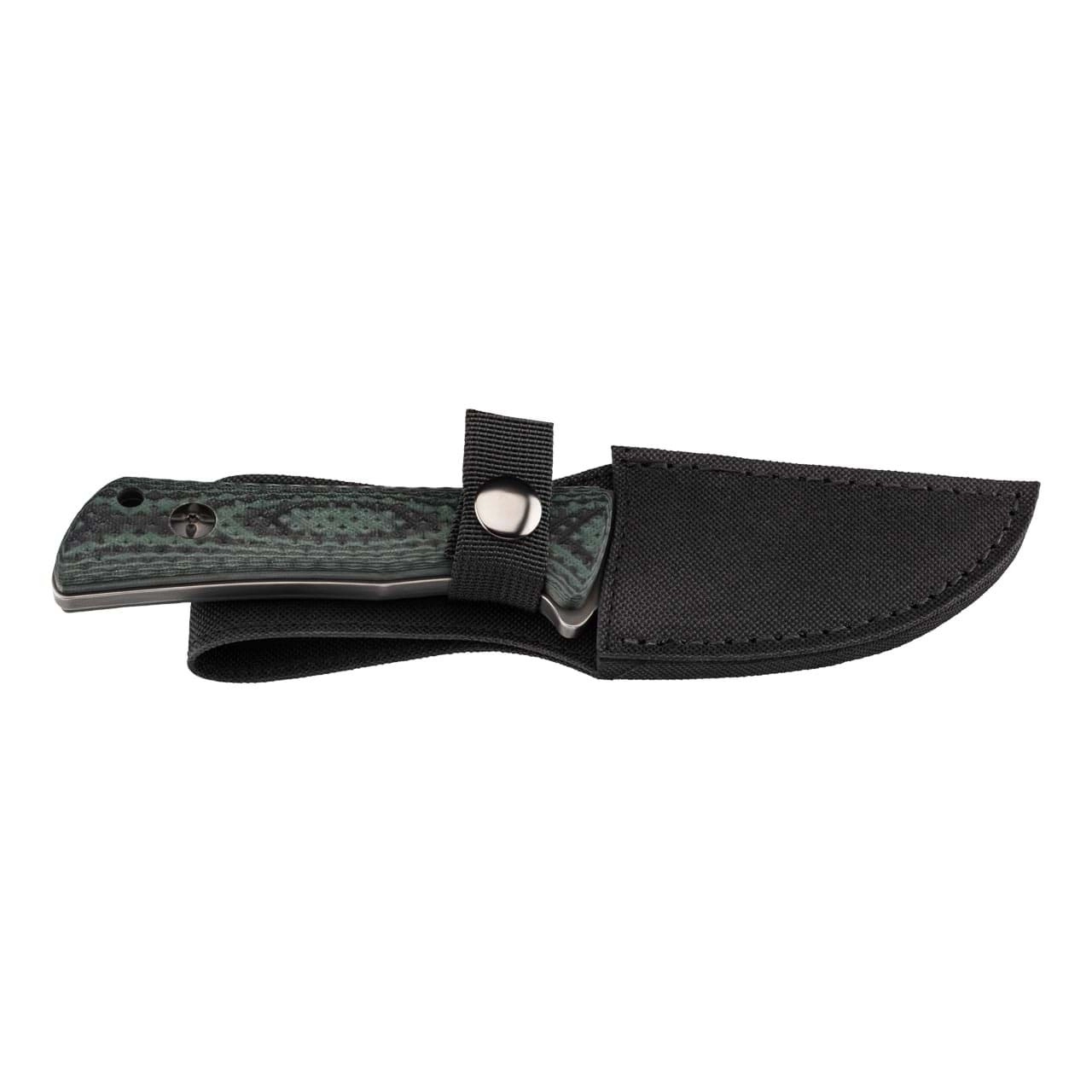 Compact and durable belt knife for outdoor use, hiking, and hunting. It features a robust full-tang blade made of AISI 420 stainless steel with a Blackwash finish, an ergonomic G10 handle with enhanced grip, and a nylon sheath with belt loop for safe carry.