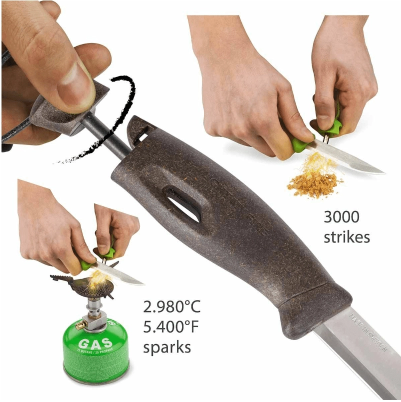 • Integrated fire starter – hidden in the handle, with a cord for easy removal.