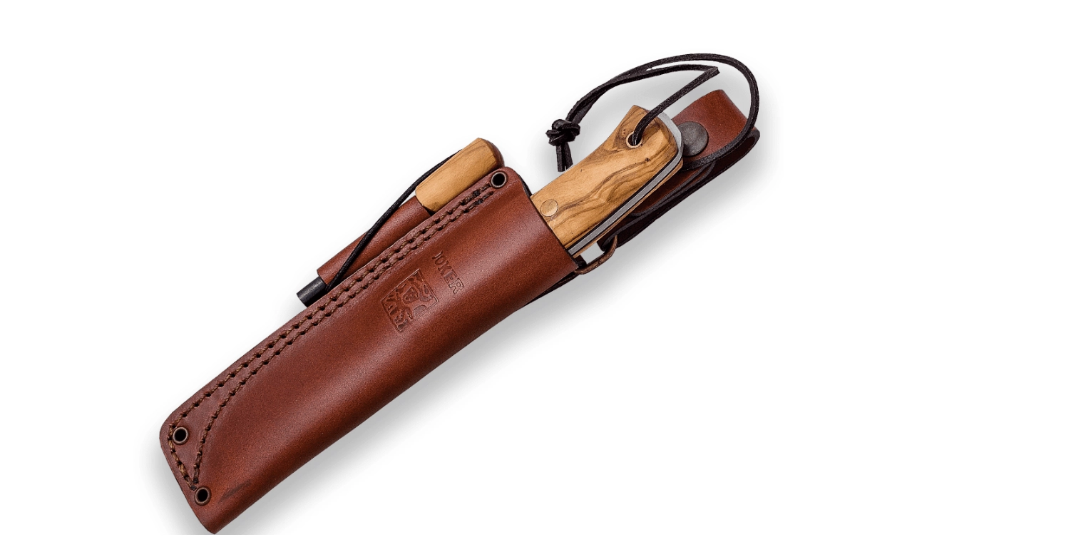 The full-tang construction with a blade made from Swedish stainless steel Sandvik 14C28N provides outstanding stability and corrosion resistance. The elegant handle made from hard olive wood not only looks great but also sits securely in the hand thanks to its pleasant ergonomics. The package includes a leather sheath, a fire starter, and a lanyard for hanging or securing.
