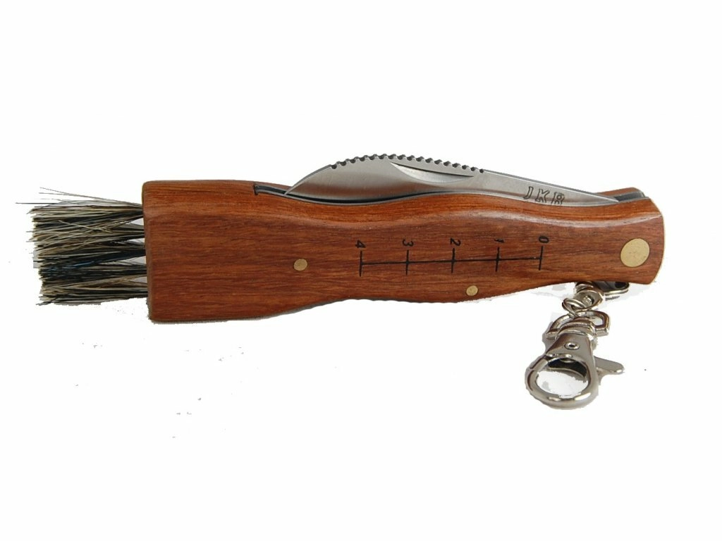 Practical mushroom knife JOKER with a 7 cm stainless steel blade has an ideal shape for cleaning mushrooms. It offers a wooden handle with carabiner, a scale for approximate measuring, and a brush for cleaning mushrooms. The package includes a nylon sheath for safe carry in the field.
