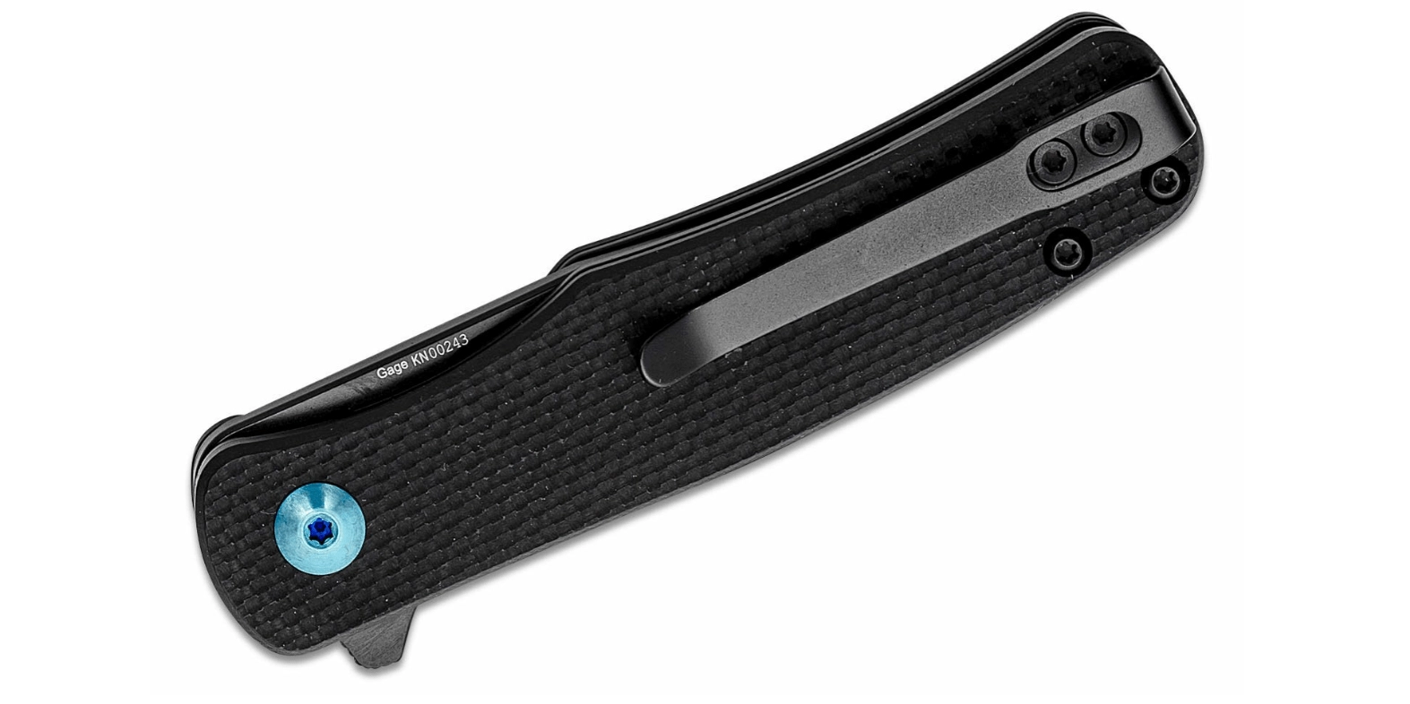 The G10 handle in an elegant black color is strong, non-slip, and comfortably contoured for a secure grip. With the integrated clip, the knife can be carried easily and discreetly in a pocket, on a belt, or on the edge of a backpack.