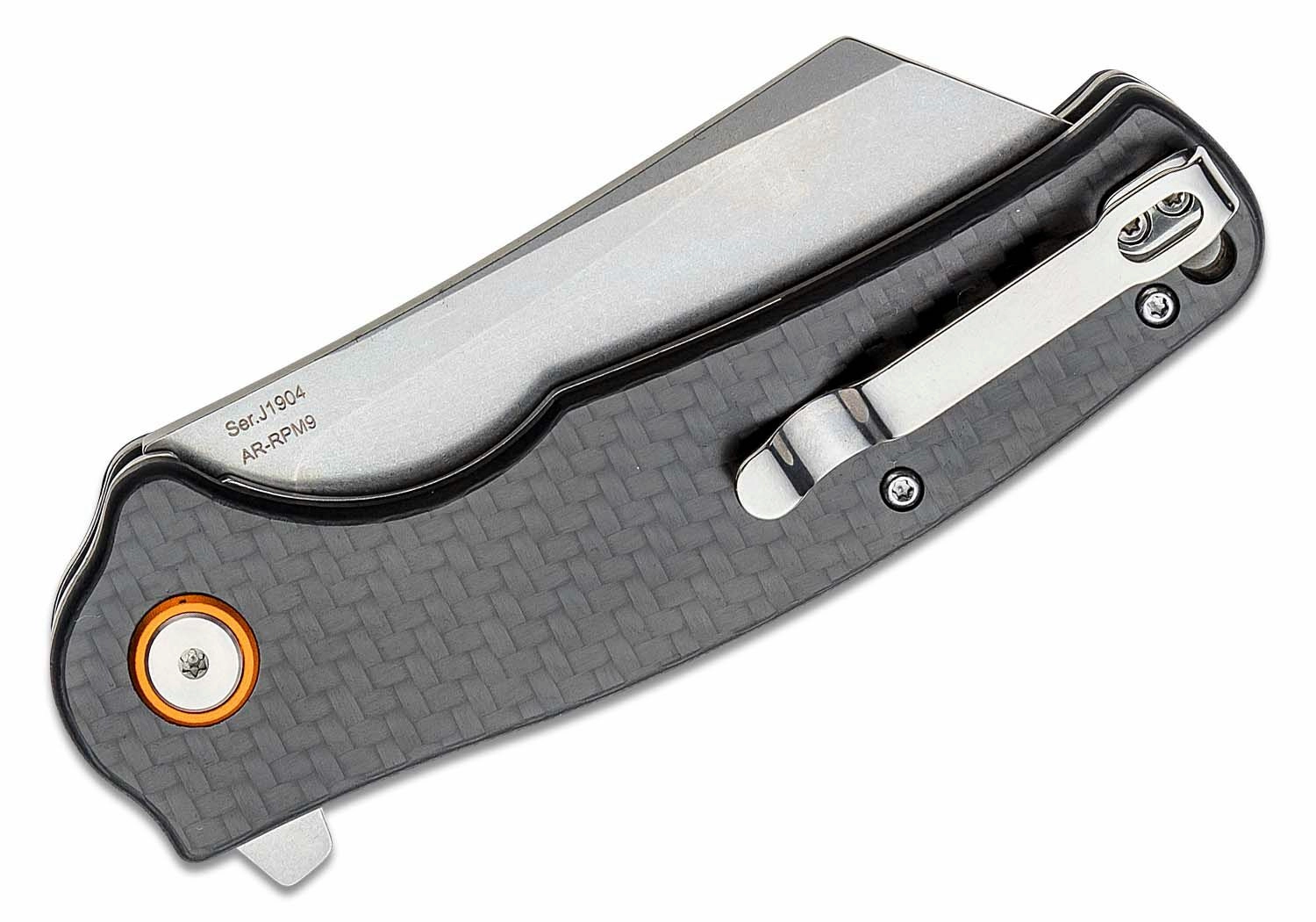 A robust and reliable pocket knife, the CJRB Crag features a cleaver-style blade made from powdered steel AR‑RPM9stonewash finish, ready for demanding tasks. Thanks to its compact size, it’s ideal for everyday (EDC) carry both outdoors and at home. The flipper ensures quick opening and the liner lock enables safe use, while the carbon fiber handle in gray offers a secure and comfortable grip.