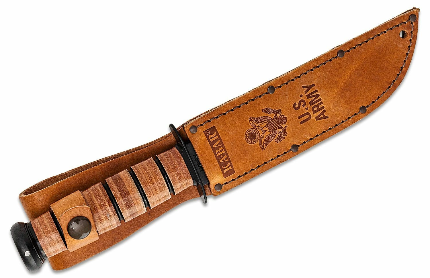 The handle is made from stacked and ground leather rings, providing a secure grip and timeless appearance. The package includes a quality leather sheath with the U.S. ARMY symbol and lettering, making the knife ready for safe storage or display in a collection.