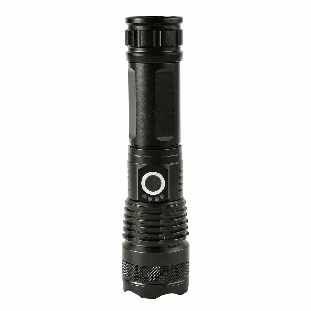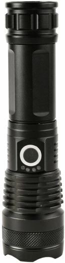 The built-in 26650 battery with a capacity of 3500 mAh charges via USB‑C. A full charge takes approximately 2–3 hours and can be done from any USB port or power bank using the included cable. Simple controls let you quickly turn on/off and adjust brightness, while the zoom smoothly changes the beam width and reach by twisting the head.
