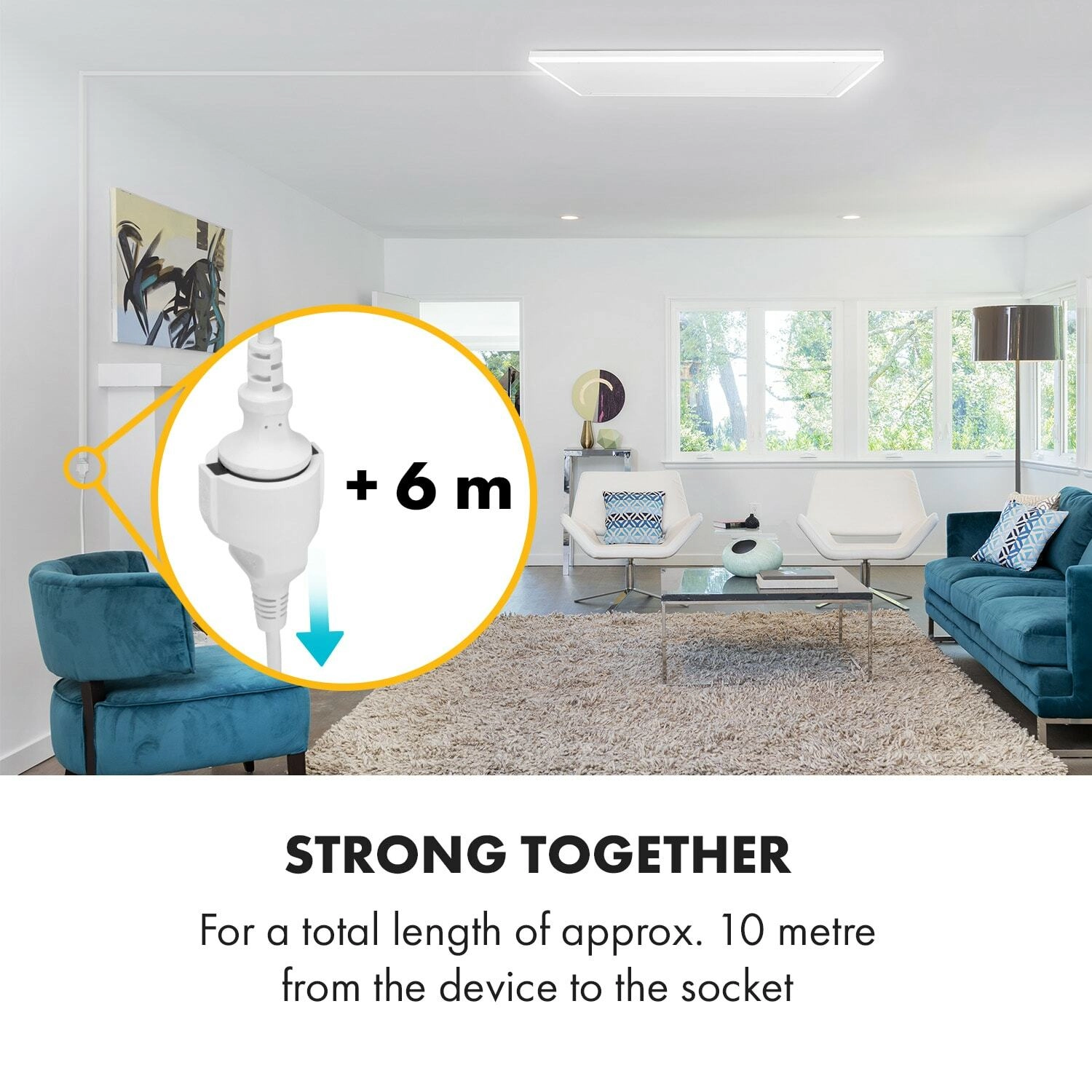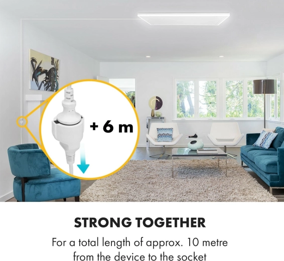 A practical 6-meter extension cable expands the reach of your ceiling infrared heater Klarstein Midnight Sun and ensures convenient power supply up to approximately 10 meters from the outlet. Ideal for flexible placement on the terrace, balcony, or in a pergola with safe and stable connection.