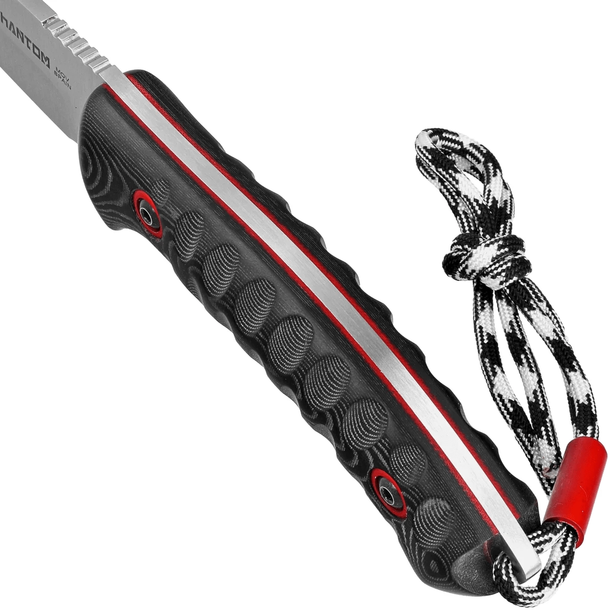 Robust universal knife Muela Phantom with a 12 cm blade, ideal for outdoor, hunting, and tactical use. It features a full-tang construction, a blade made of stainless steel 1.4116, an ergonomic micarta handle with a non-slip texture, and a practical paracord lanyard. A high-quality leather sheath for safe carry is included.