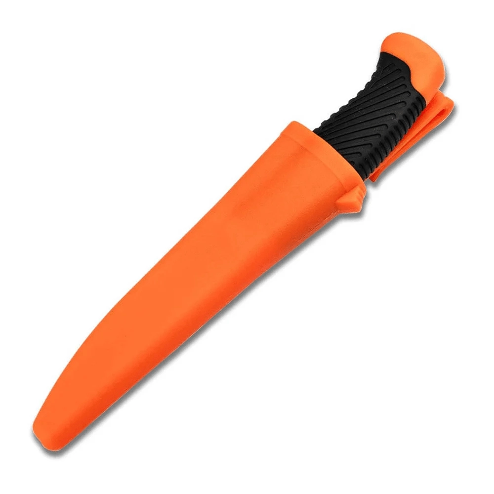 The orange handle with a textured, non-slip rubber surface ensures a secure and comfortable grip even in wet conditions. The durable plastic sheath is resistant to punctures and cuts, includes an integrated clip for easy belt attachment, and features a drainage hole to remove moisture.