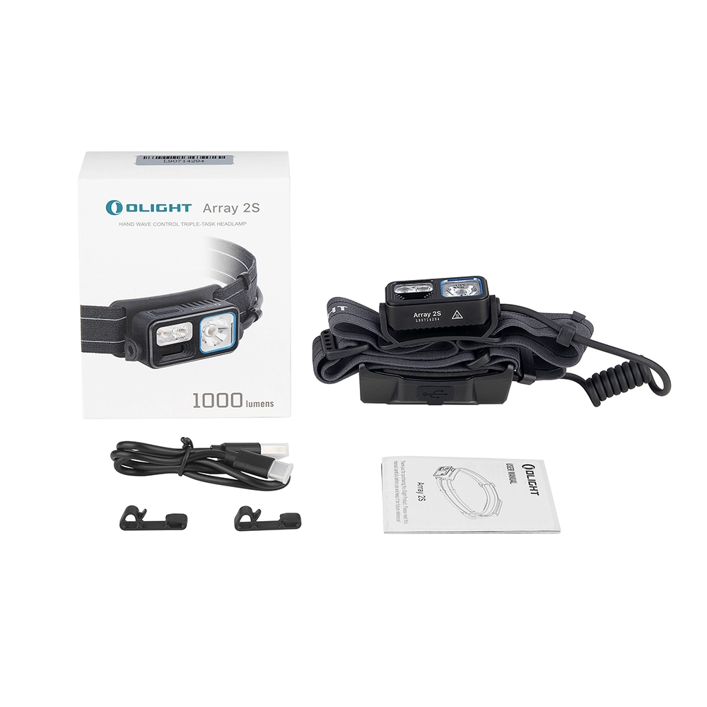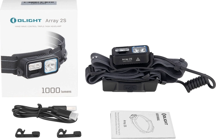 Array 2S headlamp (headband and battery pack), USB‑C cable, user manual