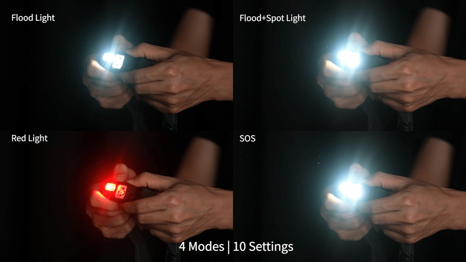 • 4 light modes: flood, flood + spot, red light, SOS