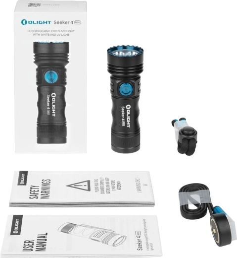 - Olight Seeker 4 Mini NW (with battery and two-way clip), lanyard, magnetic charging cable MCC1A, user manual