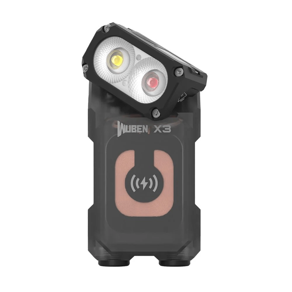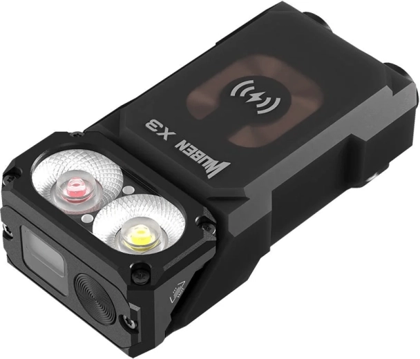 The compact EDC flashlight WUBEN X3 Black offers up to 700 lm, a throw of 102 m, a 180° rotating head with white and red light, wireless charging, and a clear LCD display. A durable IP65 build, magnetic base, and a clip for convenient carry make the X3 an ideal choice for everyday use at home, in the workshop, and outdoors.