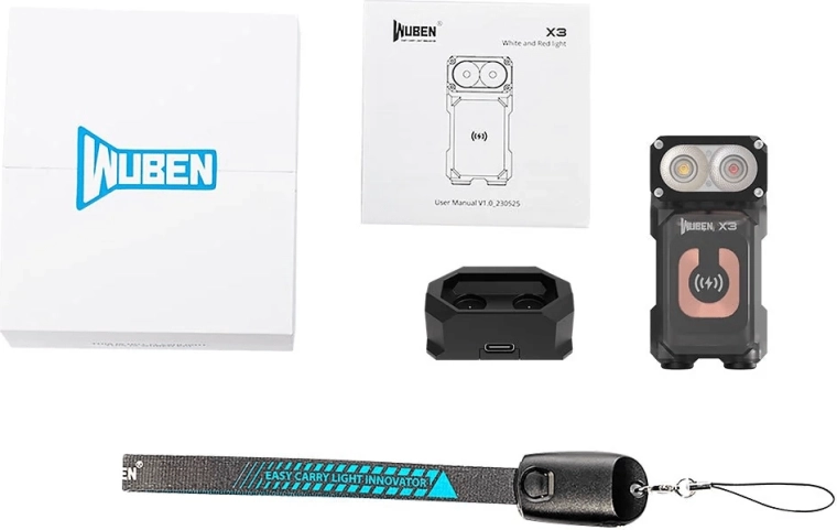 WUBEN X3 flashlight, charging base, lanyard, USB‑C cable