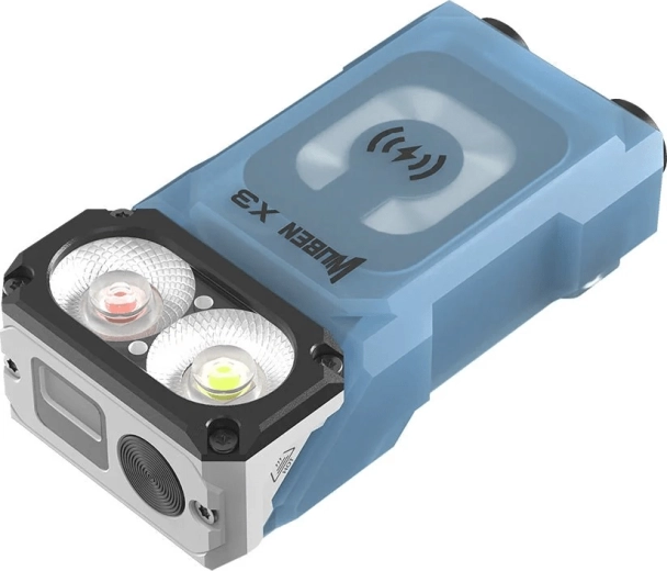 Wuben X3 Blue is an ideal pocket flashlight for everyday carry and outdoor use. The main LED Samsung LH351D delivers up to 700 lumens with a reach of 102 meters, while the auxiliary red LED Luminus SST10 provides up to 80 lm to preserve night vision. The integrated LCD display clearly shows battery status and selected mode, and the 180° rotating head makes aiming the beam easy.