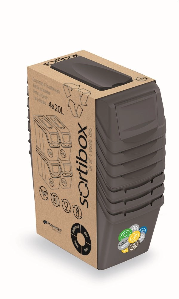 A practical set of four SORTIBOX bins for sorted waste with a capacity of 4×20 liters, ideal for both home and office. Thanks to the modular design, they can be easily combined, stacked, and adapted to your space. The elegant grey stone color fits modern interiors and makes clear waste sorting easy.