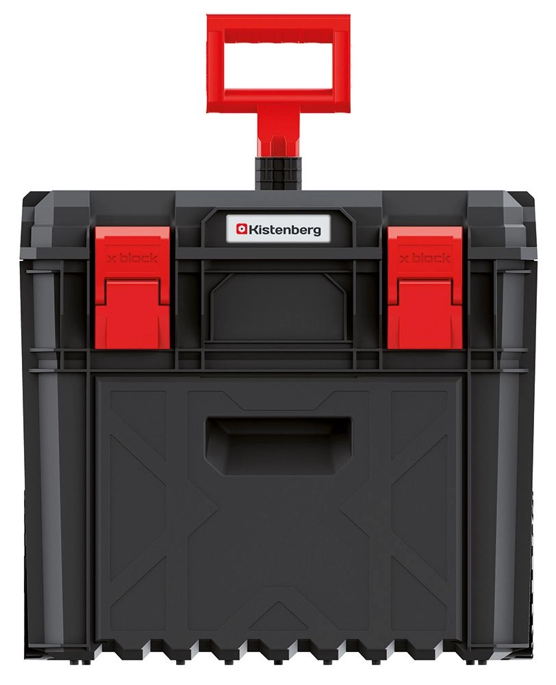 Professional rolling tool case X-BLOCK PRO with a rugged design, telescopic handle and large wheels for easy transport. Offers modular connectivity with other boxes, dust and water sealing, and load capacity up to 50 kg for safely storing even heavy tools.