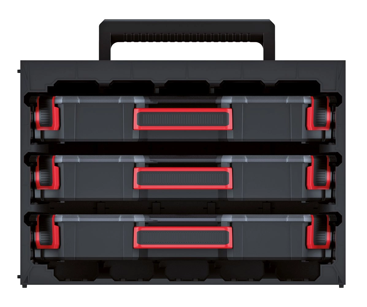 This compact cabinet with 3 TAGER CASE organizers offers a smart solution for storing screws, wall plugs, bits, electrical connectors, and other accessories. Thanks to the three removable organizers, everything stays in its place and within easy reach. The transparent lids provide quick visual checks without opening, while strong latches hold securely during transport.
