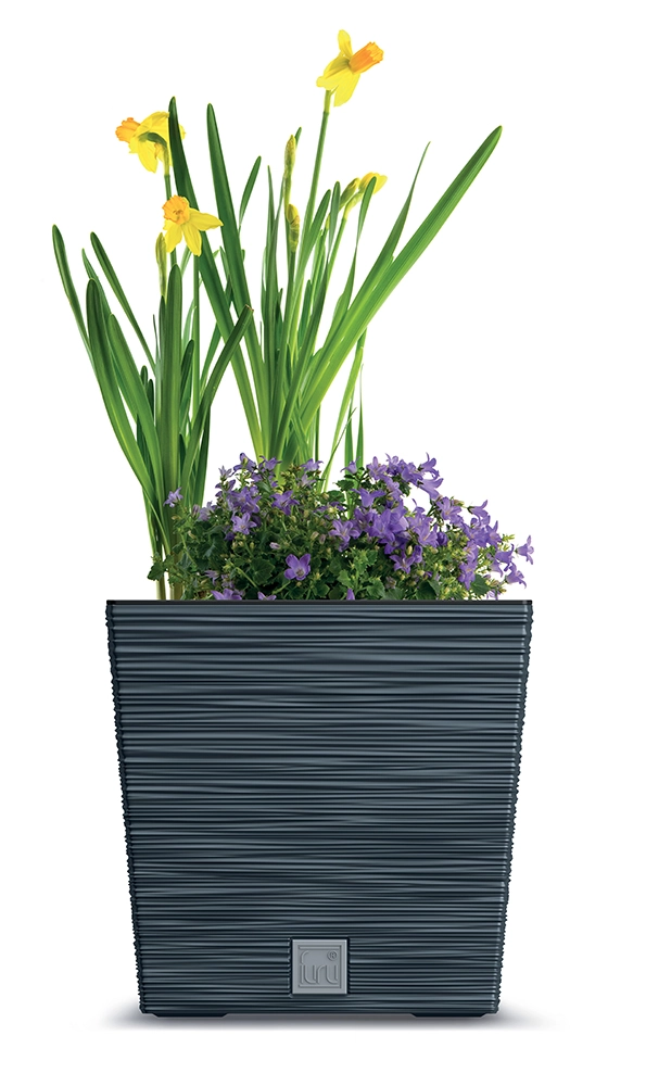 A modern square planter with a low profile in anthracite featuring a stylish ribbed design, durable plastic, and easy handling. Suitable for indoor and outdoor use, ideal for spring bulbs, herbs, and small shrubs.