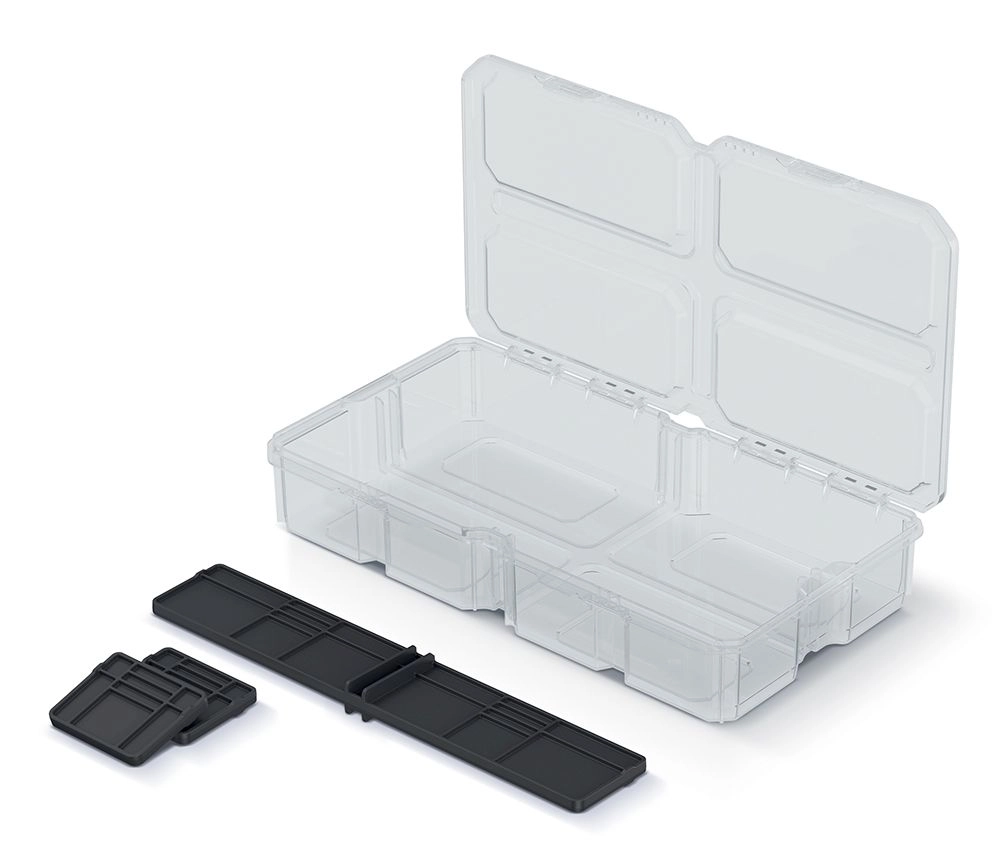The practical MSX BOX organizer in a transparent design provides a quick overview of the contents thanks to the clear lid and offers flexible arrangement using 3 removable dividers. It is easy to carry, made of durable plastic, and ideal for storing small parts, screws, or nails.