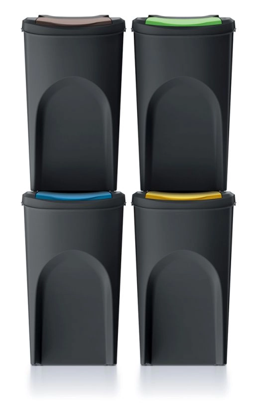 A practical set of four Sortibox bins makes waste sorting easy at home or in the office. Thanks to the modular design and easy stackability, it saves space, offers a large capacity of 4×35 l, and a modern look in recycled black.