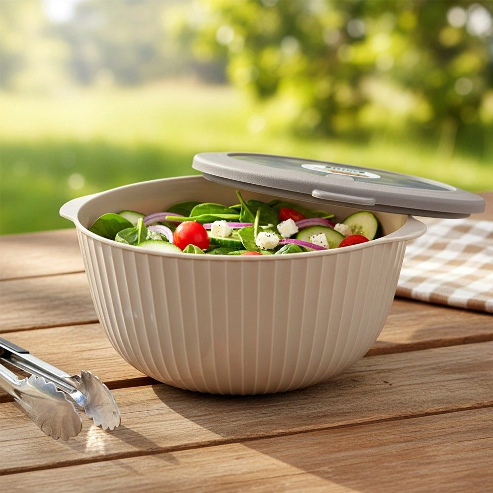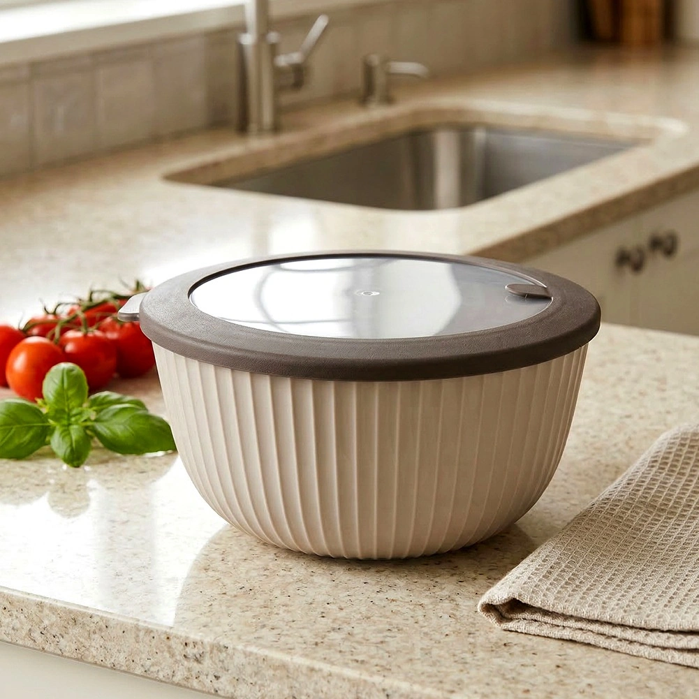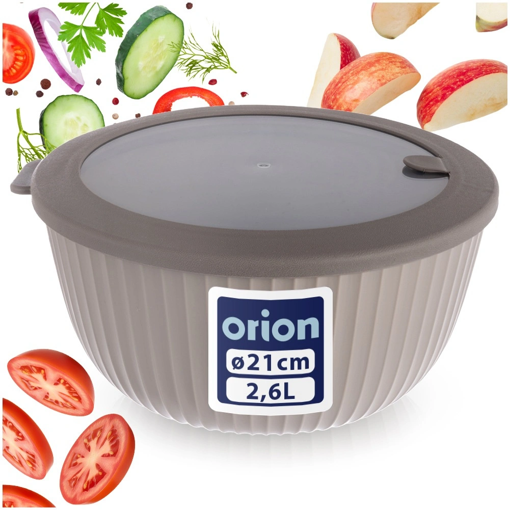 A practical kitchen bowl with a lid and a capacity of 2.5 l, ideal for mixing, serving salads, storage and microwave reheating. It has a transparent lid with a vent, a sealing rubber ring, and is made from BPA-free material, resistant from -25 °C to +95 °C. Easy to maintain and dishwasher safe.