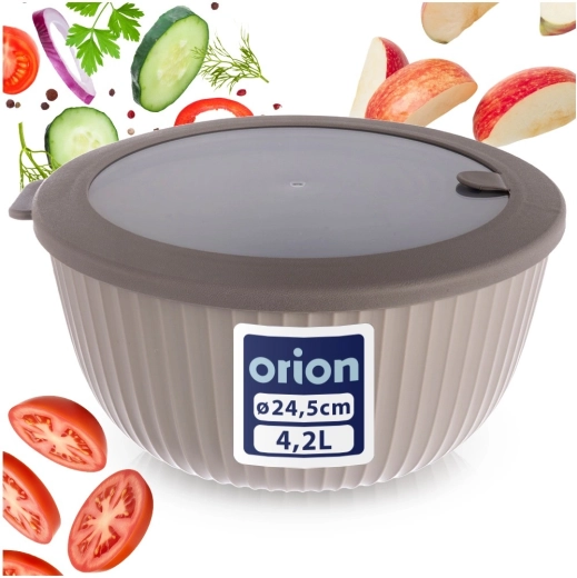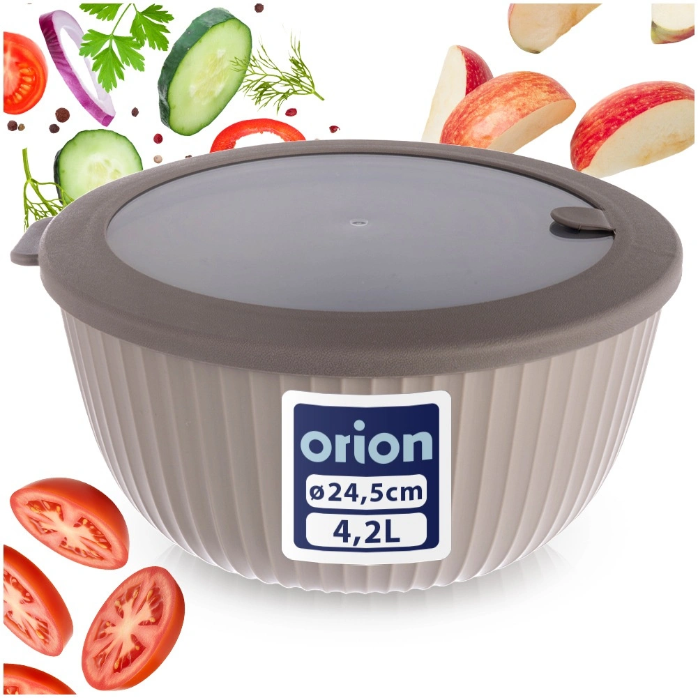 A practical kitchen bowl with a capacity of 4 l and a diameter of approx. 24.5 cm is ideal for mixing, proofing dough, serving salads, and storing and reheating food. It has a transparent lid with a sealing insert and a microwave steam vent, is BPA free, heat-resistant from -25 °C to +95 °C, and dishwasher safe.