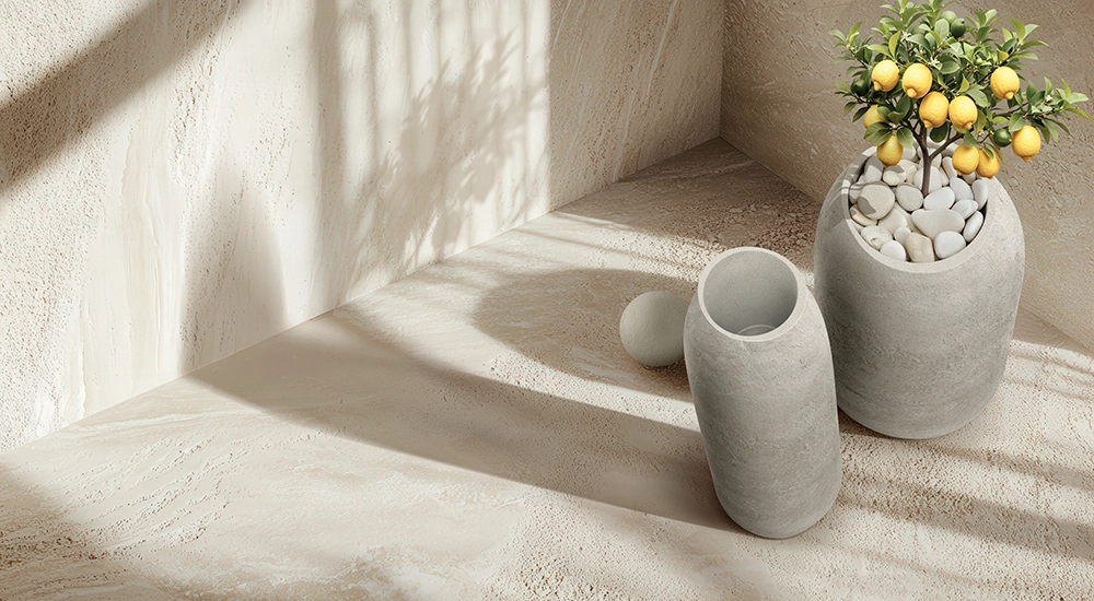 The fine texture and graphite color create a luxurious feel that suits modern interiors as well as entrances and façades.