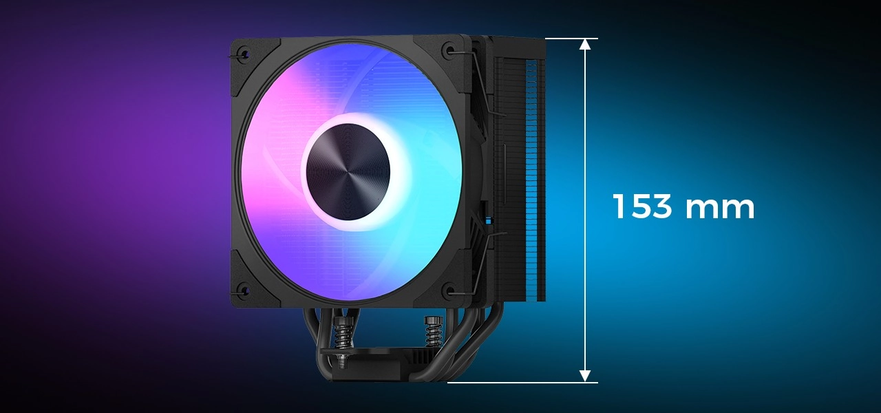 The 120 mm PWM fan operates in a wide speed range of 600–2000 RPM, so you can easily tune your cooling curve to your needs—from silent operation to maximum performance. Thanks to 75 CFM airflow and just 28 dBA noise, the cooler is ideal even for late-night gaming. The height of just 153 mm simplifies installation in most ATX cases, and compatibility with common sockets makes it a universal choice for gamers and creators.