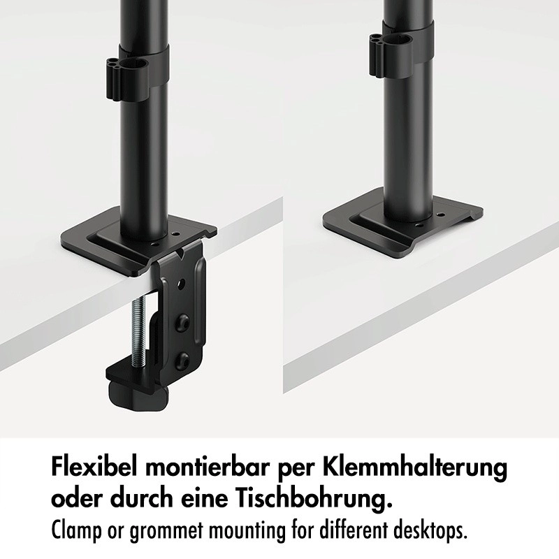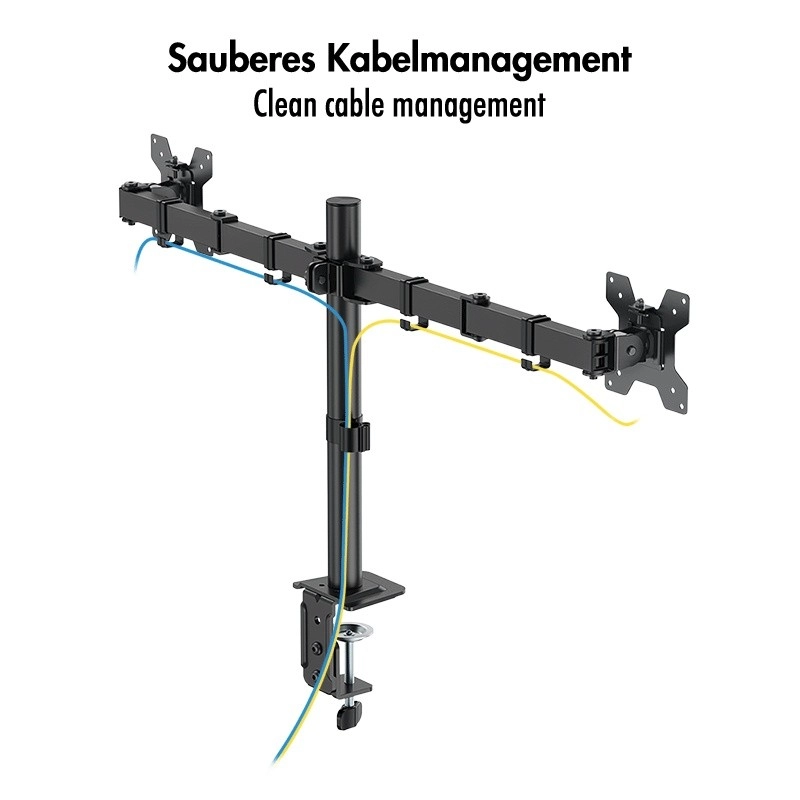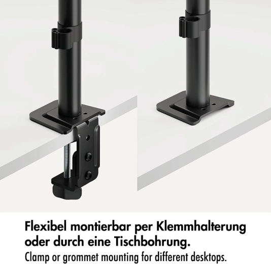 Installation is quick thanks to removable VESA plates and the choice of mounting via desk clamp or grommet. Integrated cable-management clips keep routing inside the arms and ensure a tidy desktop appearance.