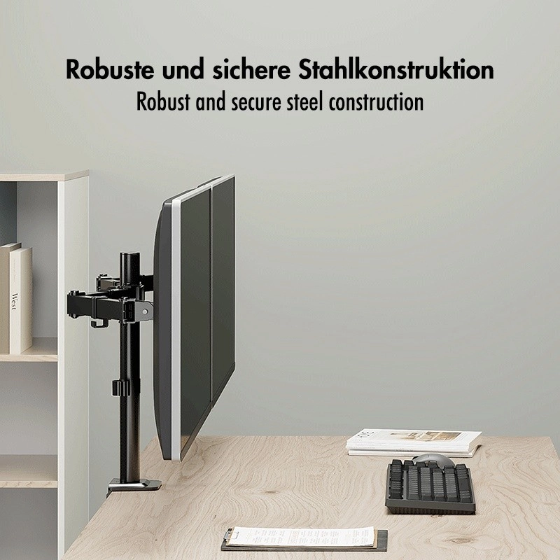 The LogiLink BP0217 dual mount securely and comfortably holds two monitors sized 17–32" with a load capacity of 10 kg per arm. It offers a wide adjustment range for perfect ergonomics: tilt 45°, swivel 90°, and rotation 360° for landscape and portrait work. A sturdy steel construction, easy installation via desk clamp or grommet, and integrated cable management ensure a clean, organized workspace.