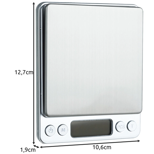 The compact RUHHY digital scale offers 0.01 g accuracy up to 500 g, making it ideal for the kitchen and for weighing jewelry and small ingredients. Thanks to the TARE function, backlit LCD, and included bowls, work is fast, convenient, and highly precise.