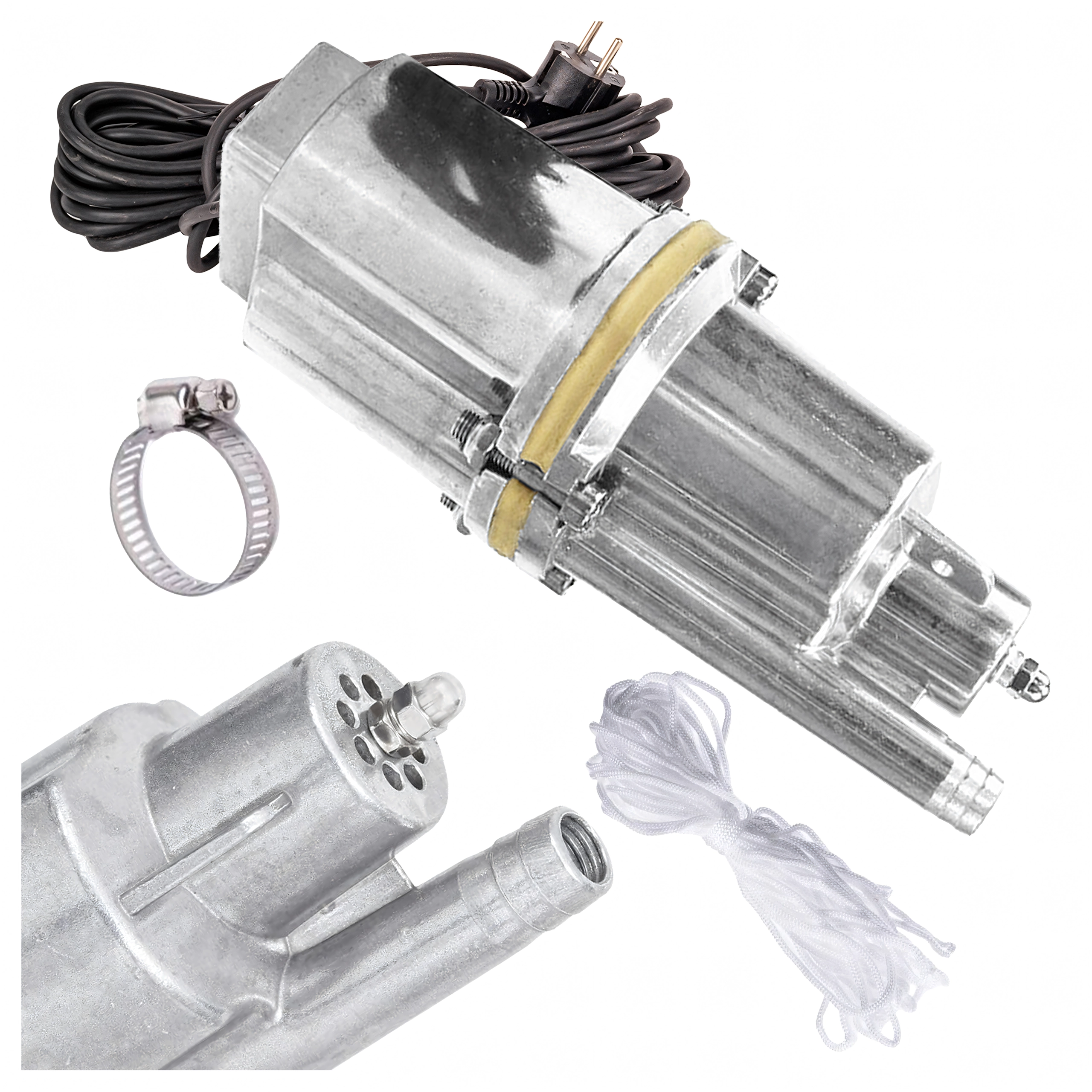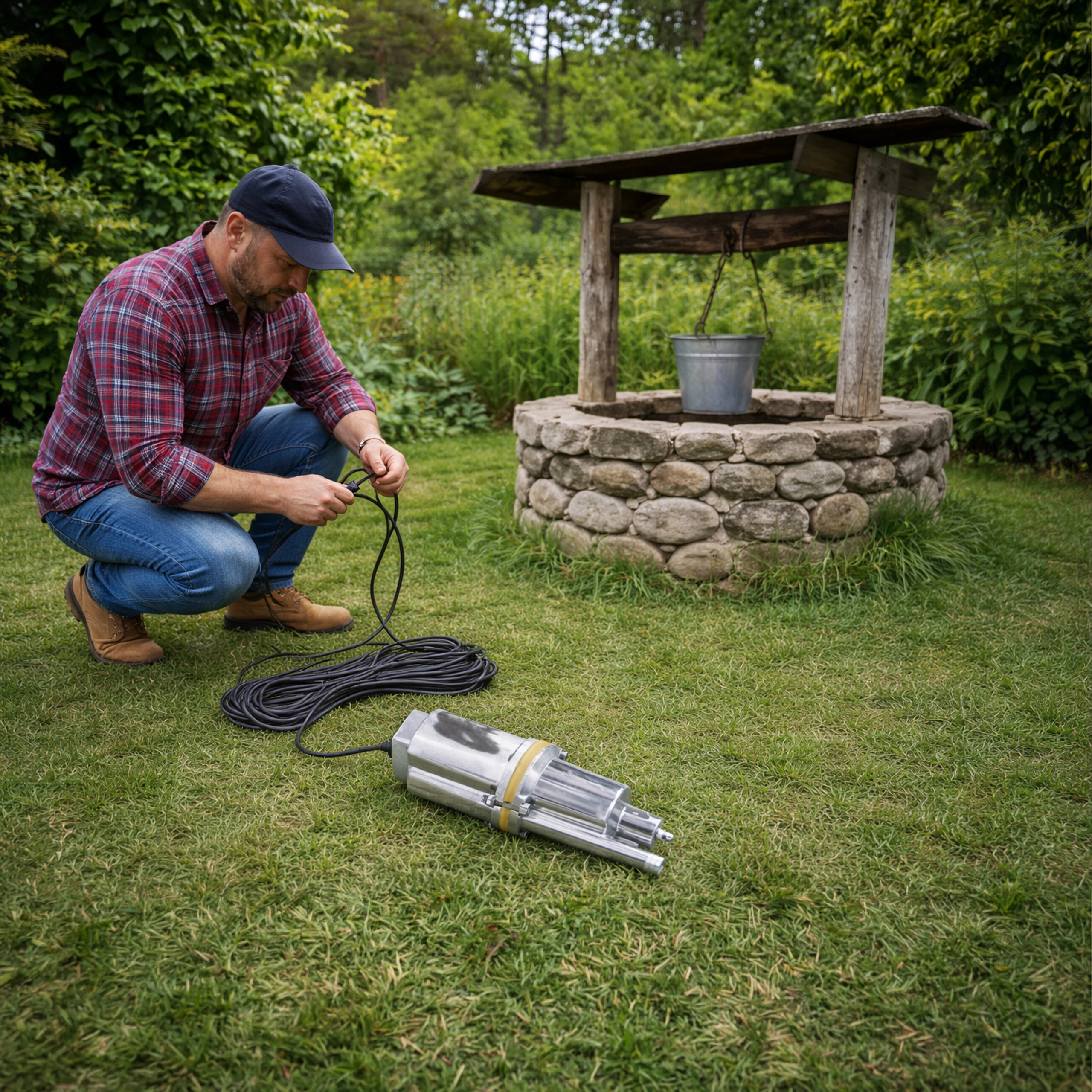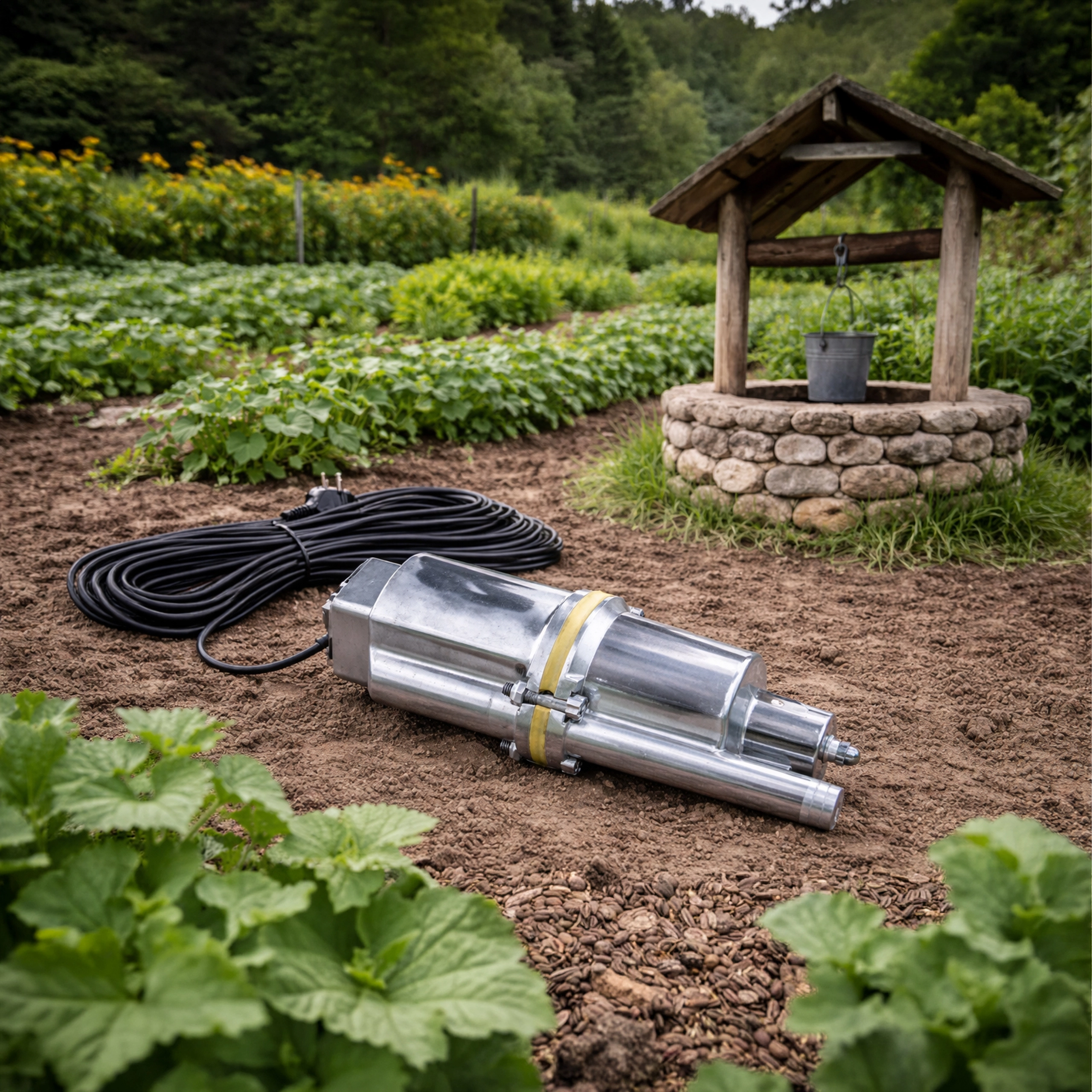 Powerful submersible clean water pump for wells and deep boreholes with 1500 W input power and flow rate up to 1100 l/h. A durable metal body, compact shape, and easy hose connection make it a reliable solution for garden irrigation, well water pumping, and emergency dewatering.