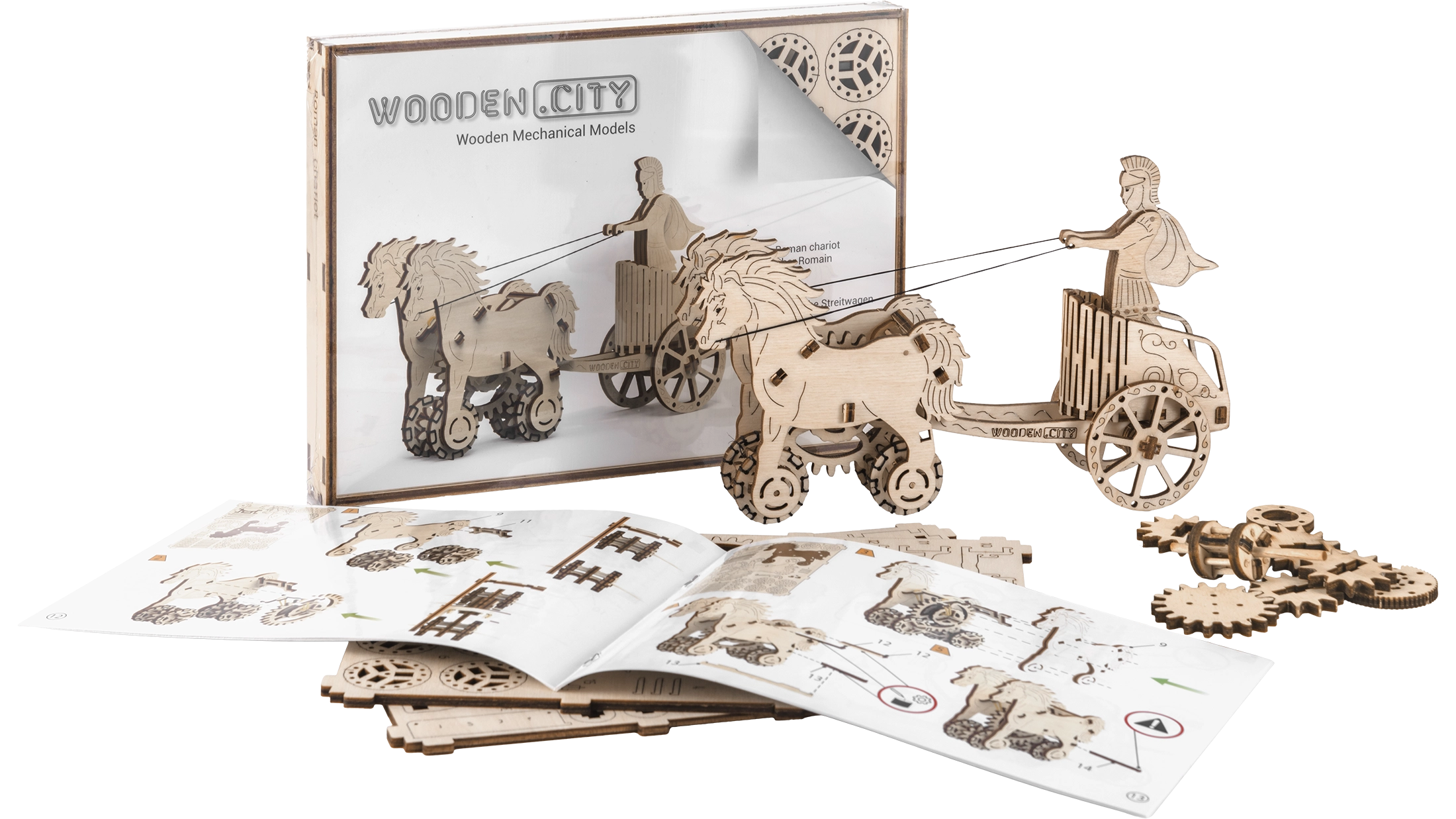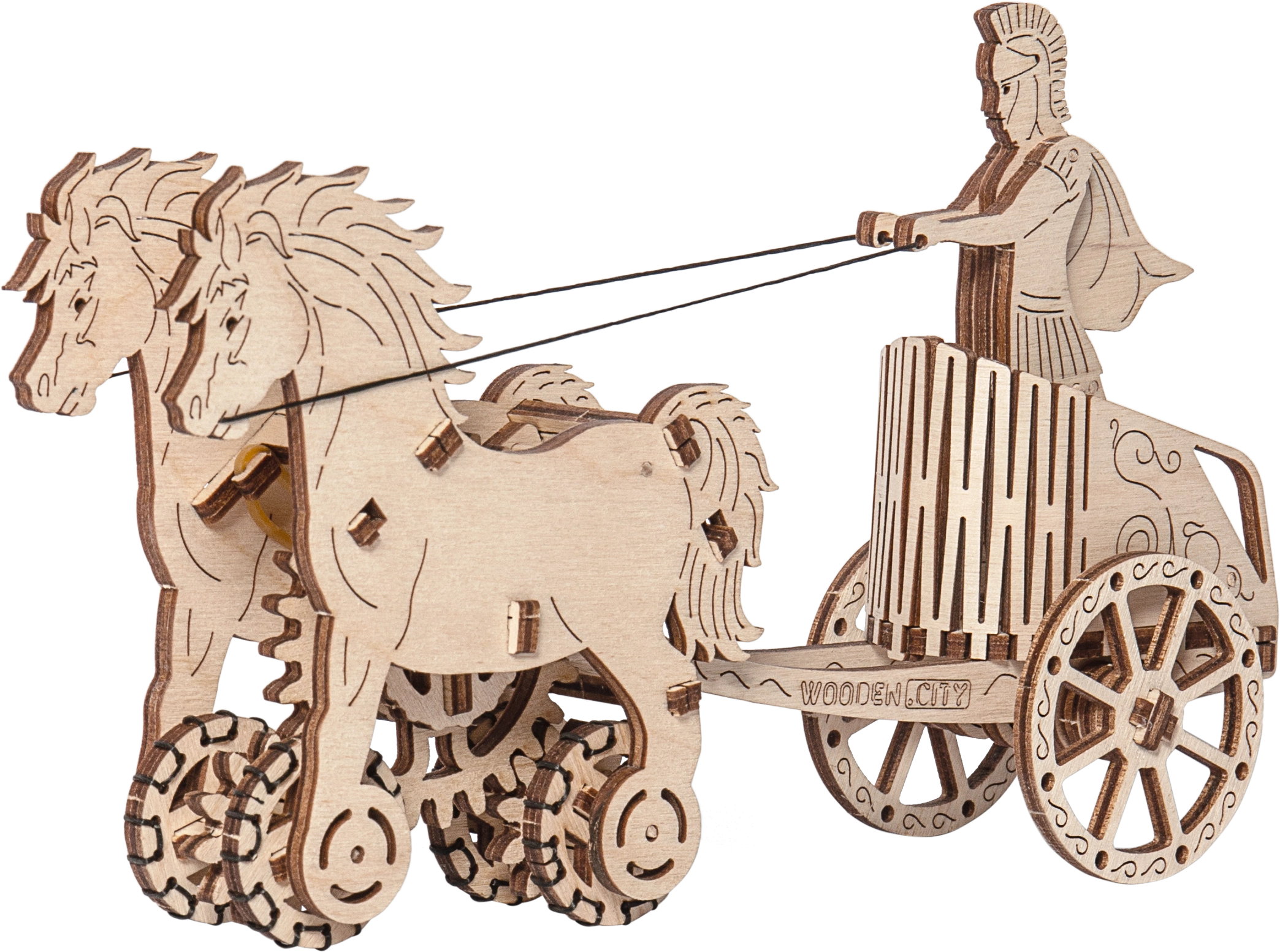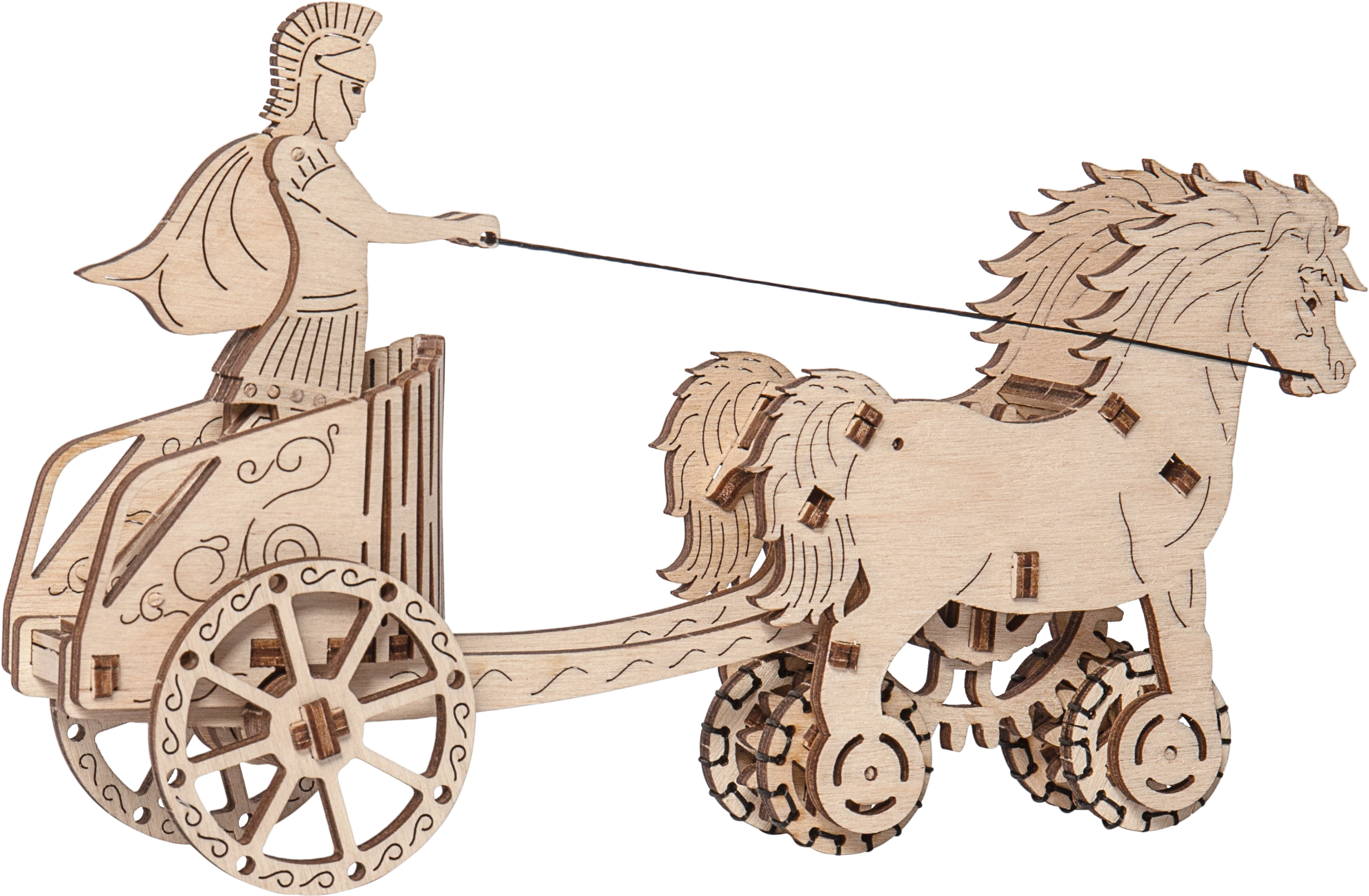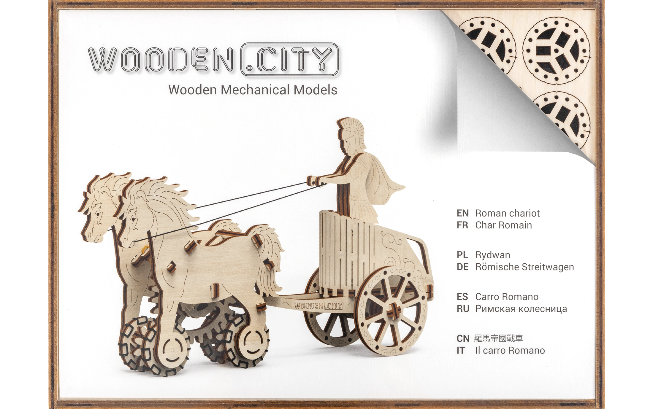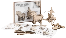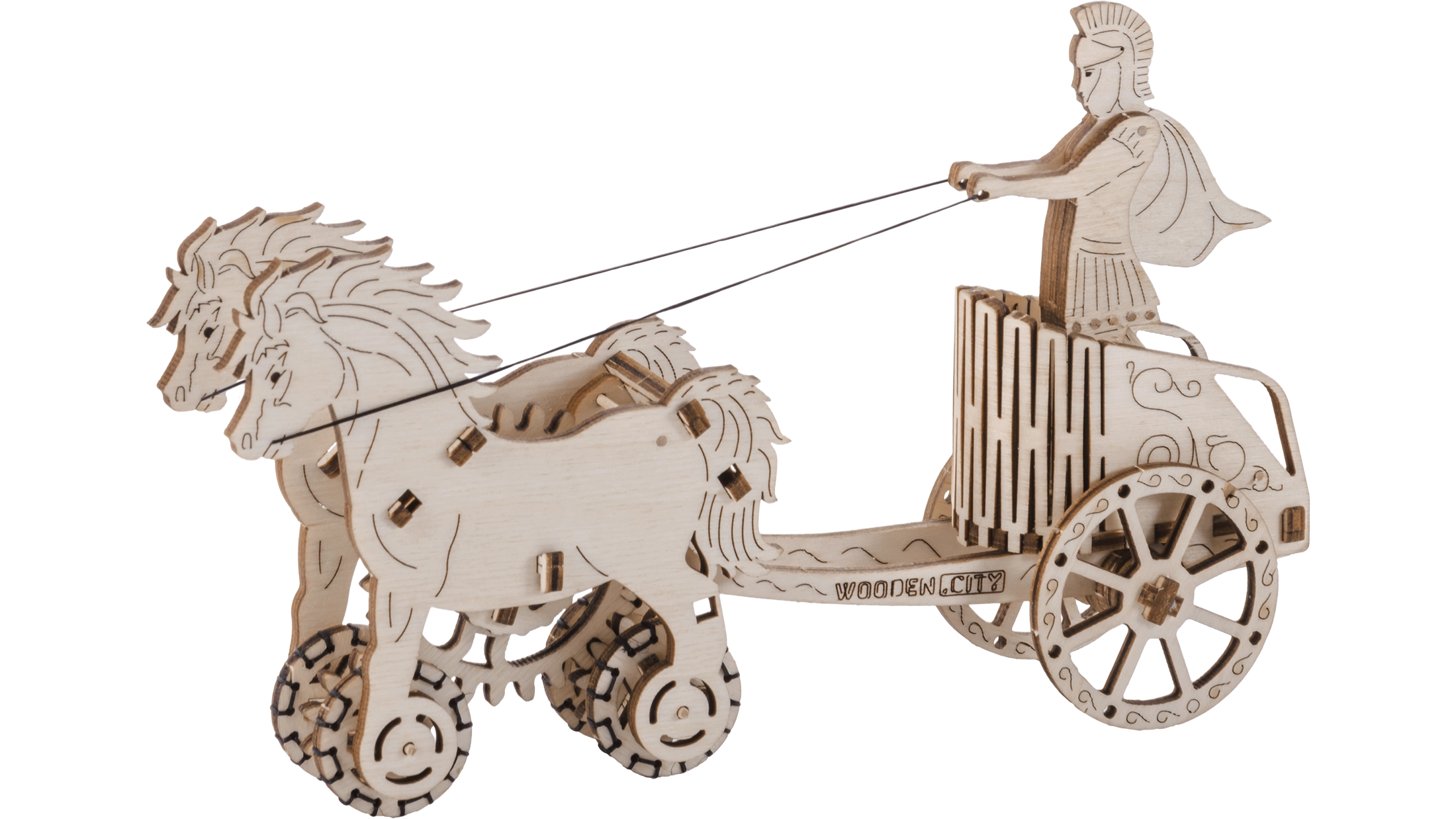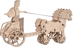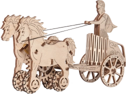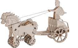 In the name of the empire. A Roman chariot kit with a two-horse team, made of plywood. The faithfully depicted chariot features a finely detailed figure of a Roman rider. Thanks to the wind-up mechanism, the model can move; at the start it can rear the horse team and travels up to 1 meter. Organize races with other Wooden City models! Comes with detailed assembly instructions. Main features: 74 precisely cut pieces, low assembly difficulty, the finished model can move on its own.