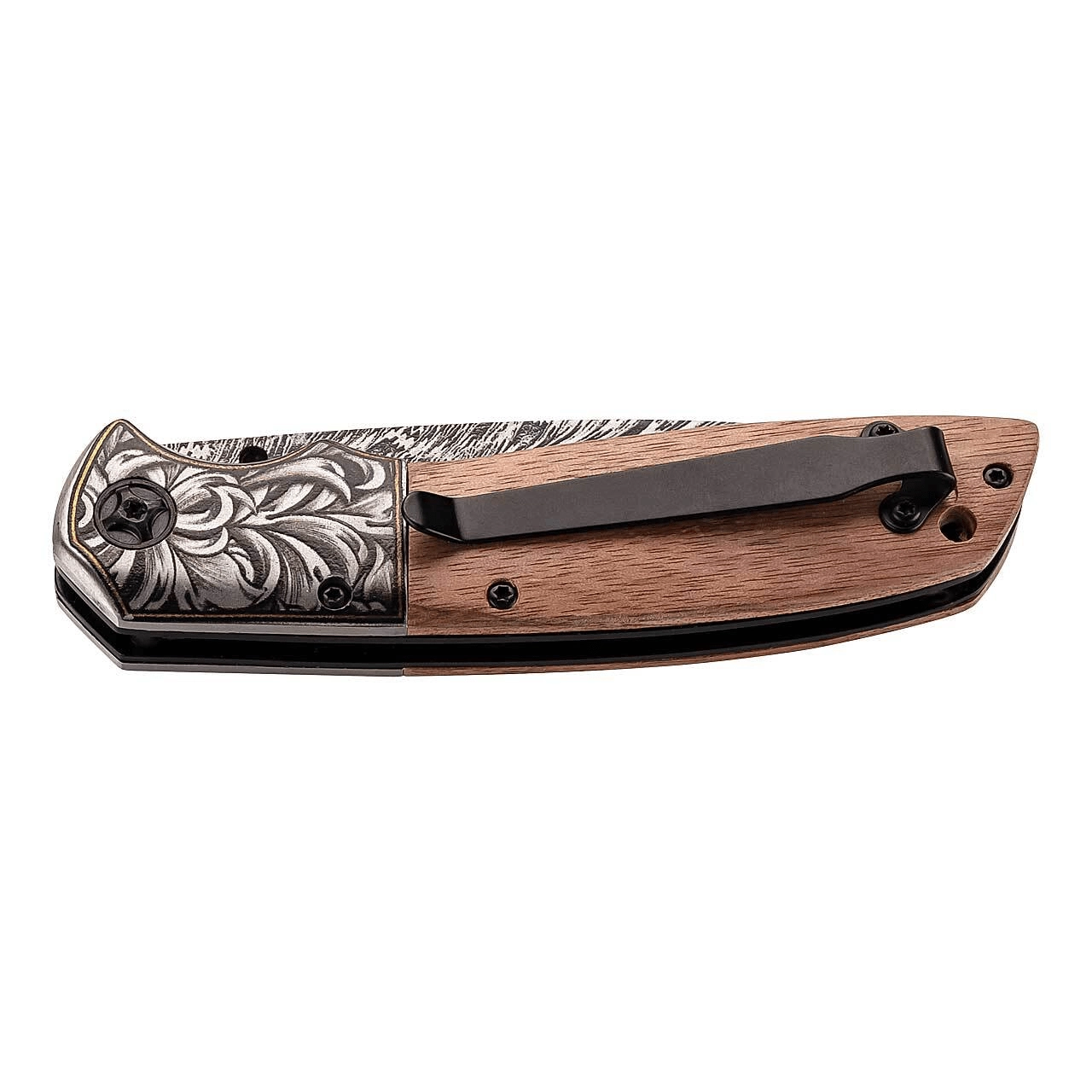 Elegant pocket knife HERBERTZ for everyday use or as a stylish gift. It features a AISI 420 stainless steel blade with an engraved floral motif, comfortable thumb stud opening, and secure Linerlock. The walnut wood handle fits the hand well, there is a pocket clip for right-side carry and a lanyard hole.