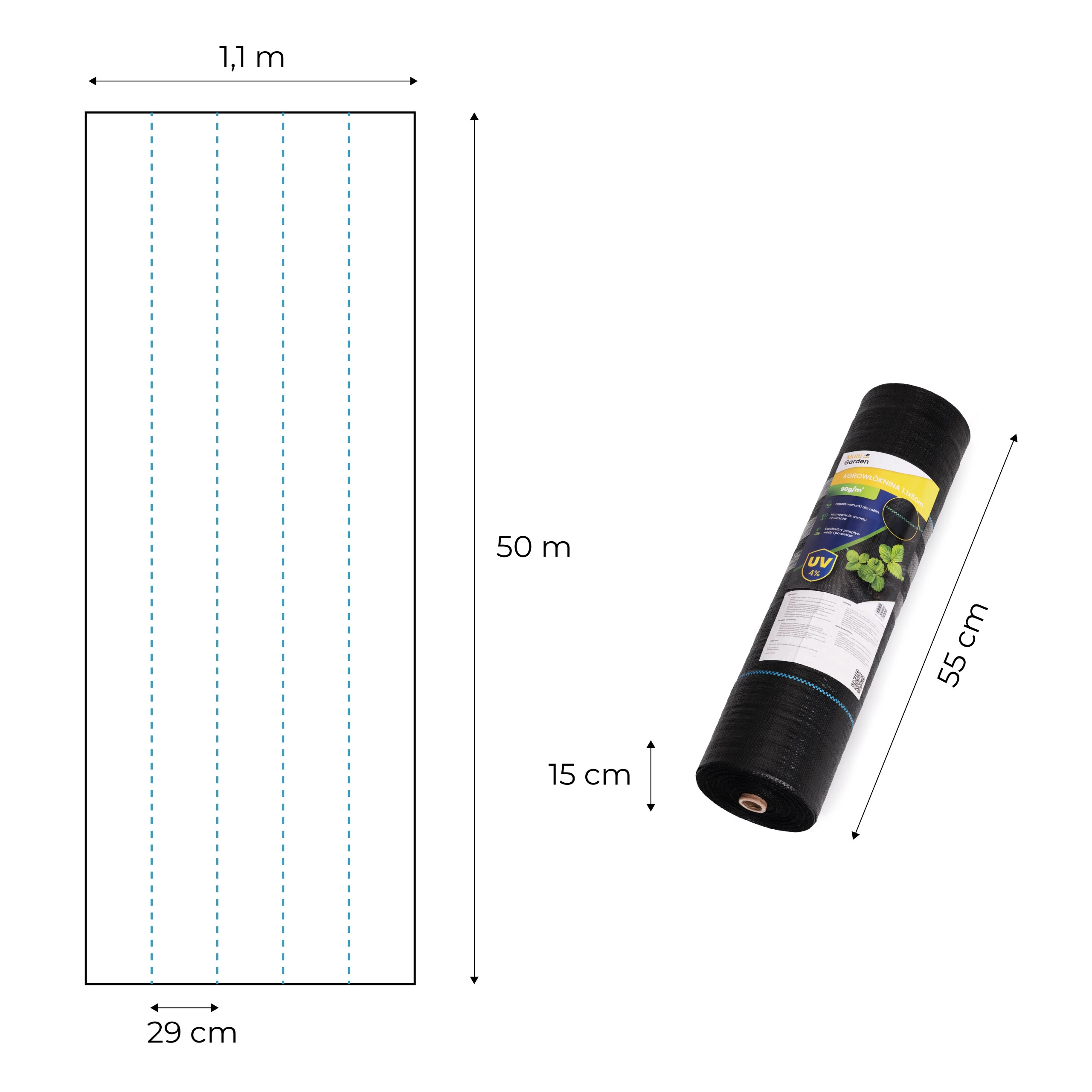 Thanks to its UV resistance and dense woven PP structure, it resists tearing, moisture, and variable weather for many seasons. Blue guiding lines every 29 cm make spacing plans and precise cuts easier. The set includes 50 plastic pegs (10 cm) for secure anchoring, keeping the fabric in place even in wind.