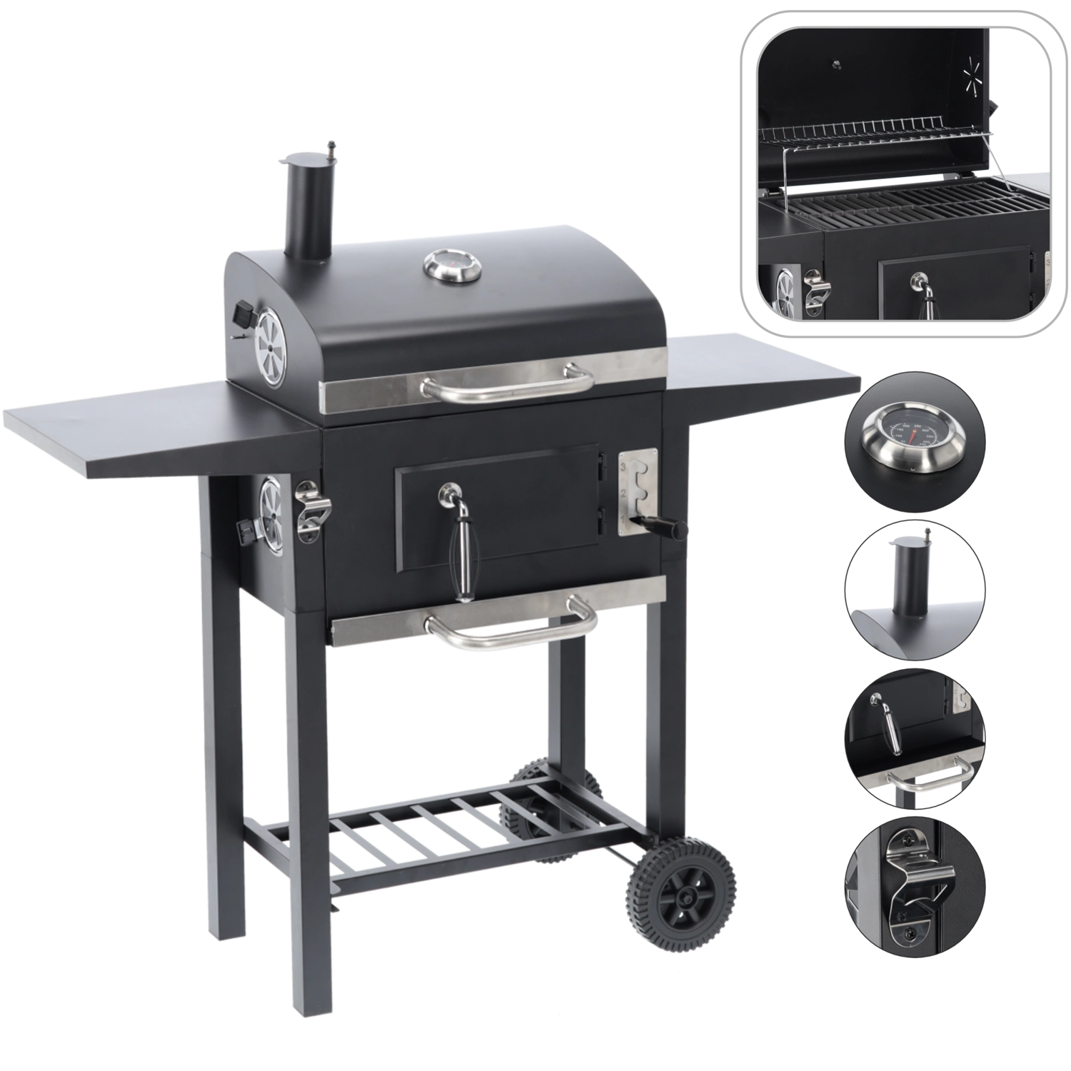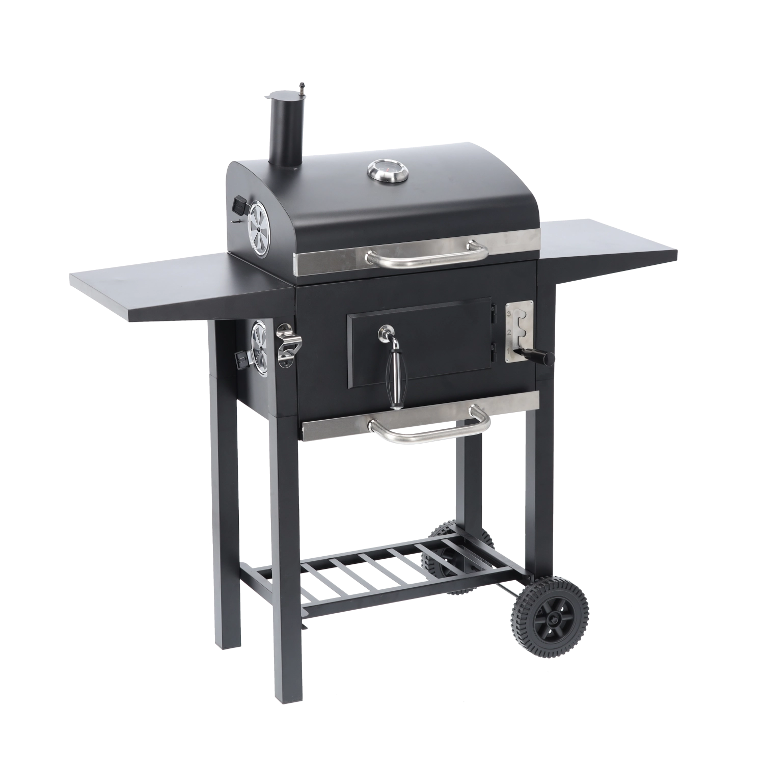 Two robust wheels, side shelves, and a lower rack for briquettes ensure easy repositioning and practical workflow while grilling.