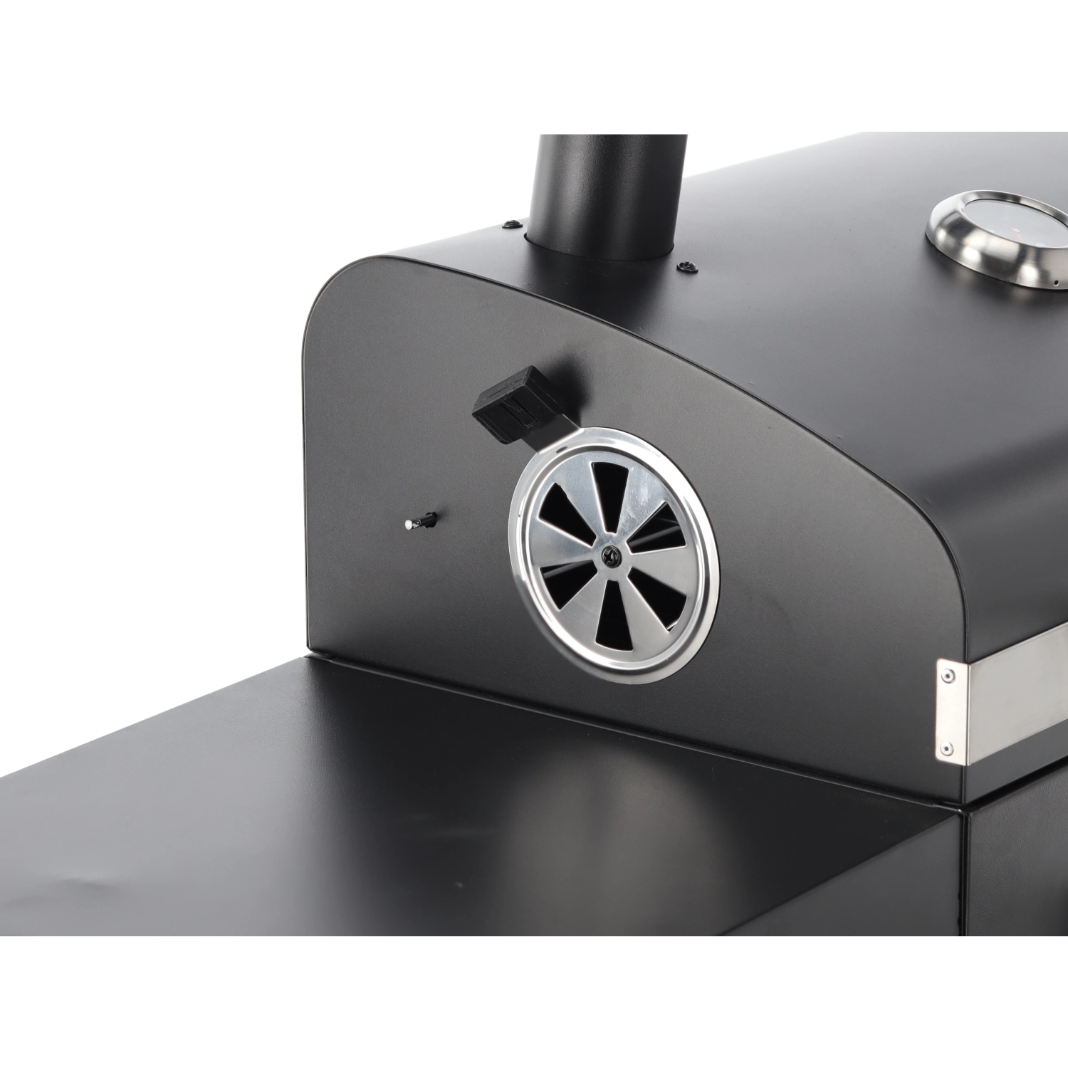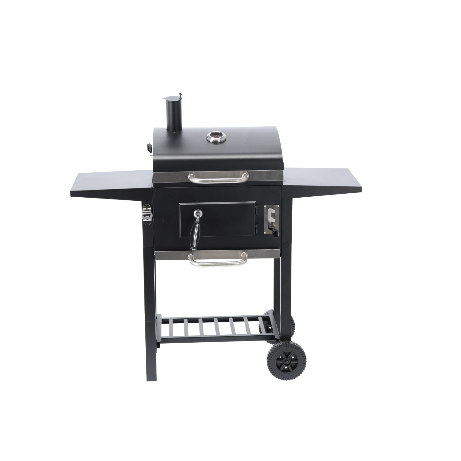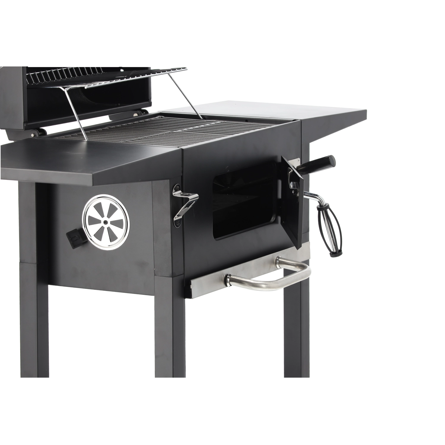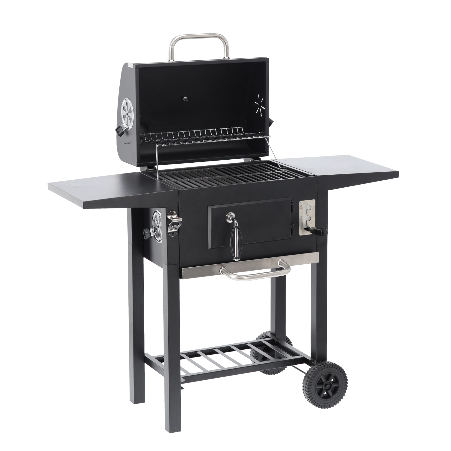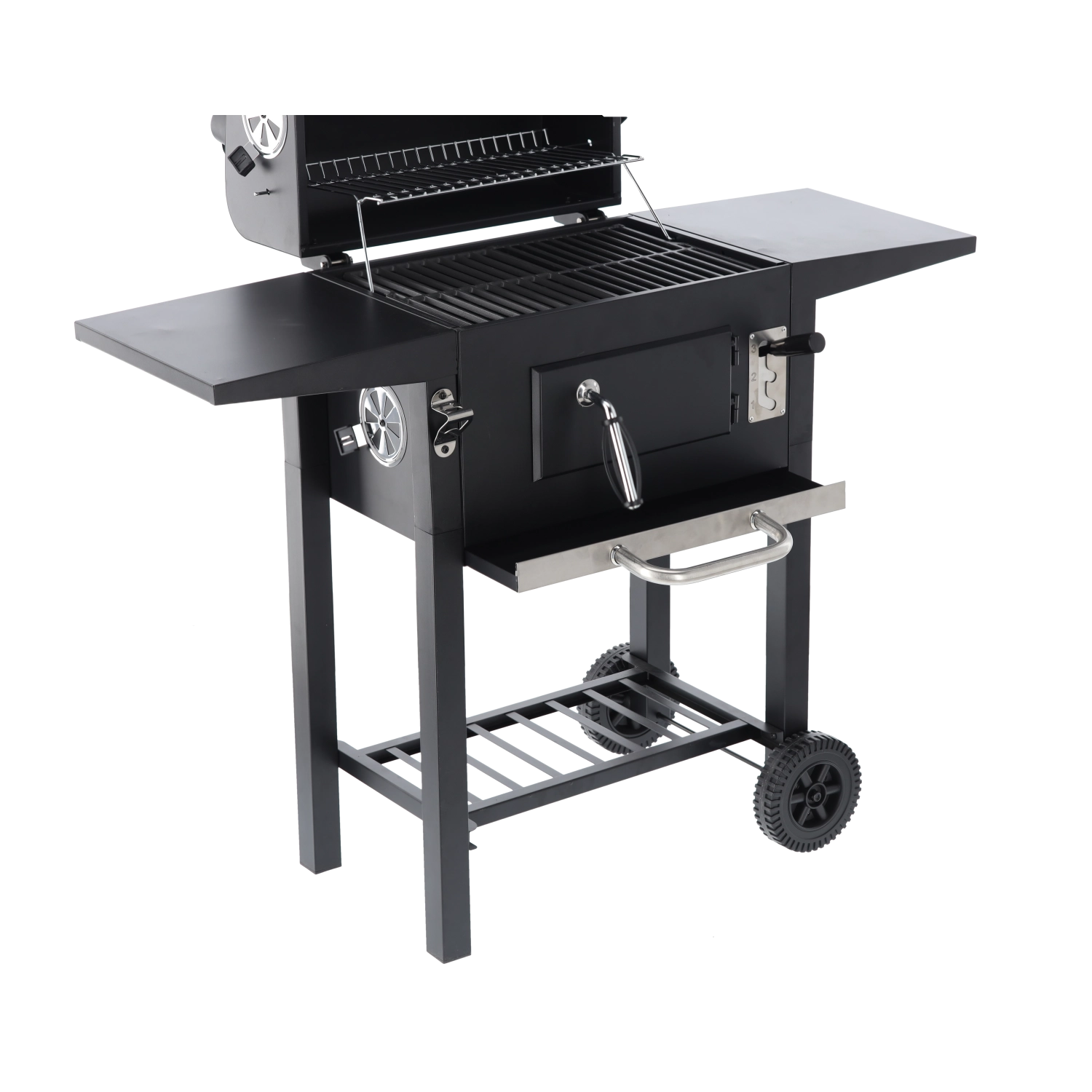 The grill is designed for easy use in the garden or at the cottage: wheels make handling effortless, side shelves provide space for ingredients and tools, and the front doors allow convenient refueling. With adjustable vents and a chimney, you’ll always have airflow and temperature under control.