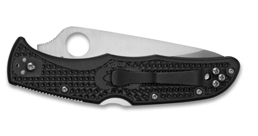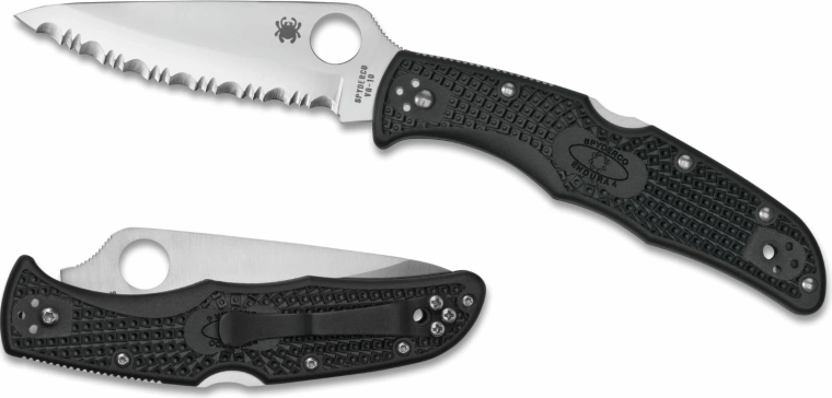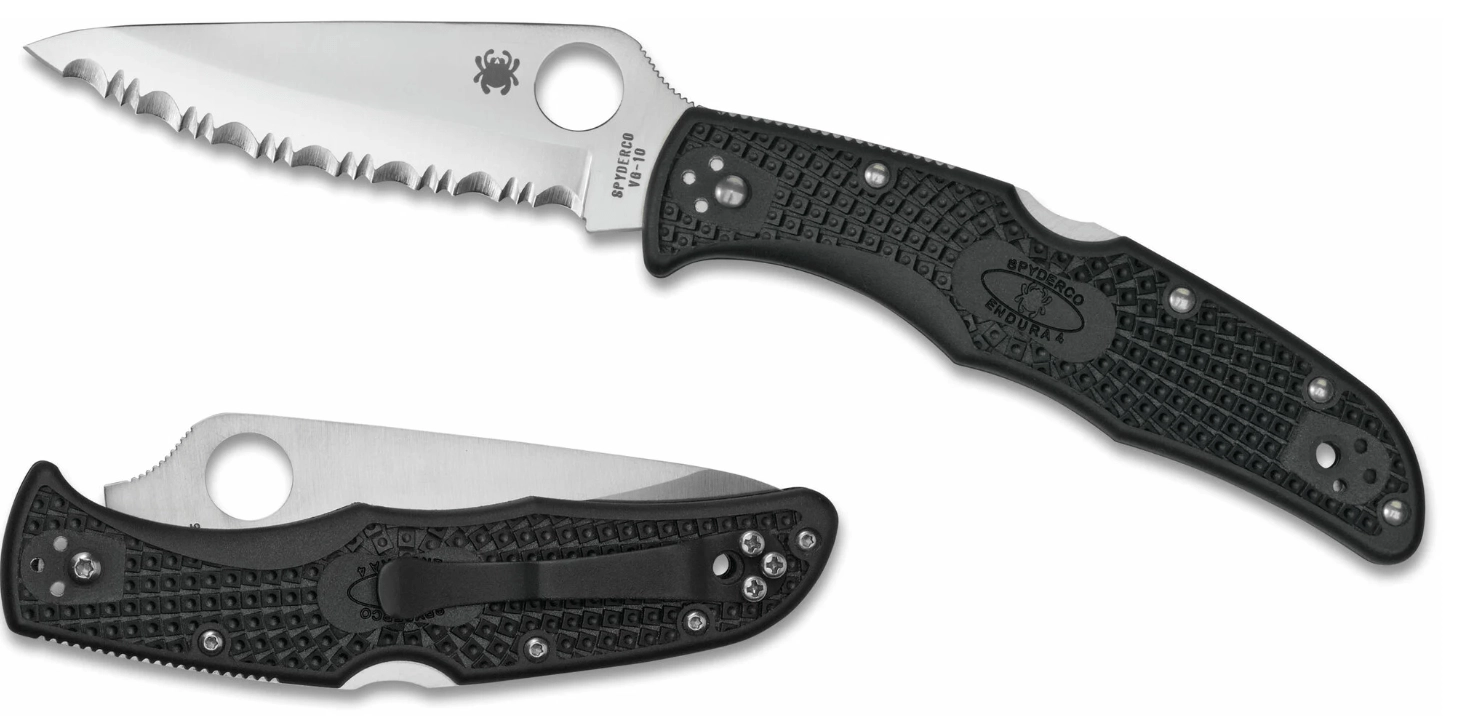 The lightweight yet durable Spyderco Endura 4 Lightweight pocket knife with a serrated edge offers an excellent weight-to-performance ratio for everyday carry. The serrated Wharncliffe blade made from Japanese VG-10 steel easily cuts ropes, textiles, and packaging. A reliable back lock, FRN handle with anti-slip texture, and a steel clip make it a versatile EDC tool.